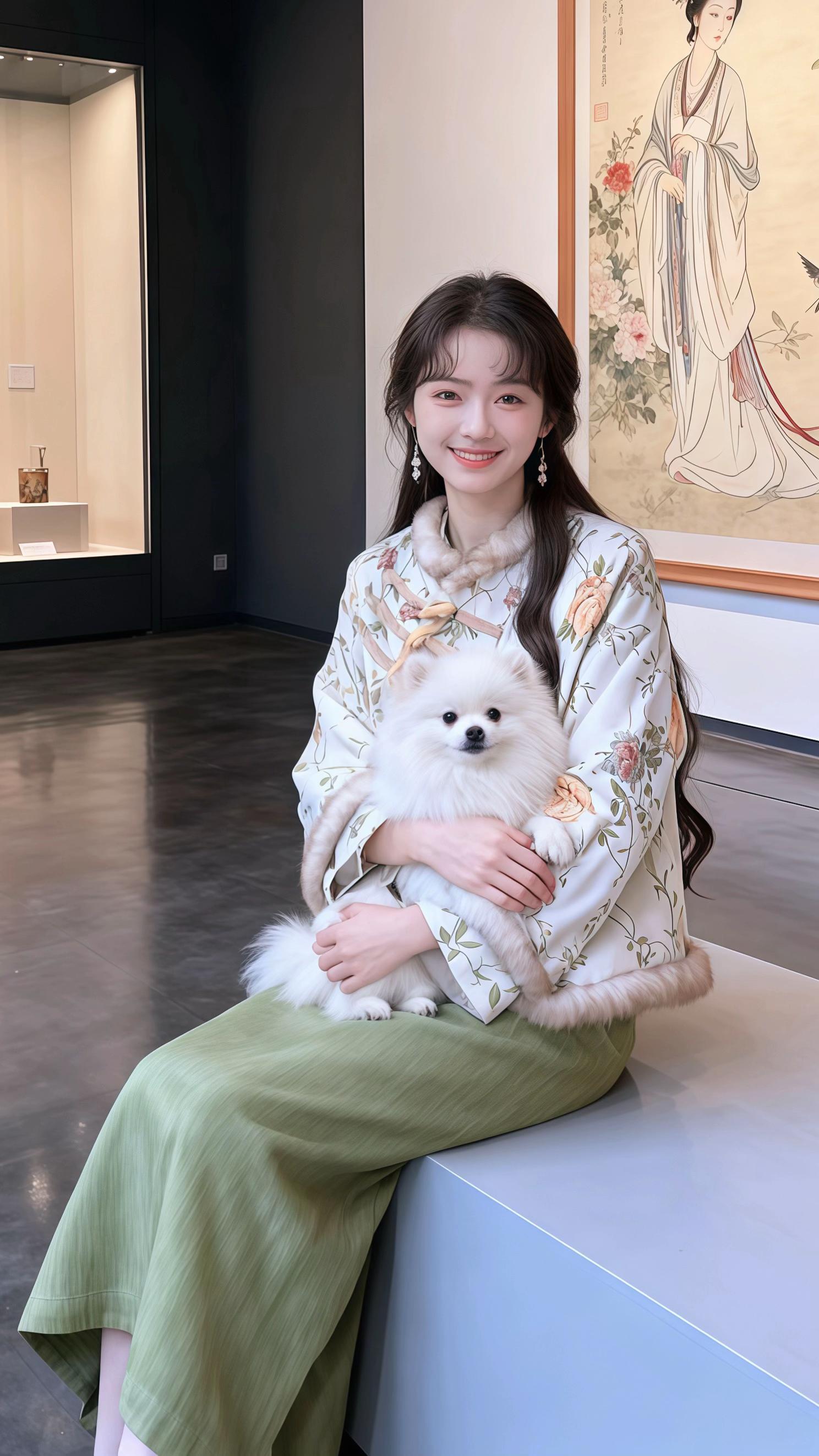她忍不住凑近,指尖刚触到画框,一阵眩晕袭来。再睁眼,展厅的射灯变成了泛黄的宫灯,墙上的电子导览屏换成了水墨屏风。怀里多了个软乎乎的团子——是只博美犬,身后还跟着只慵懒的白猫。
