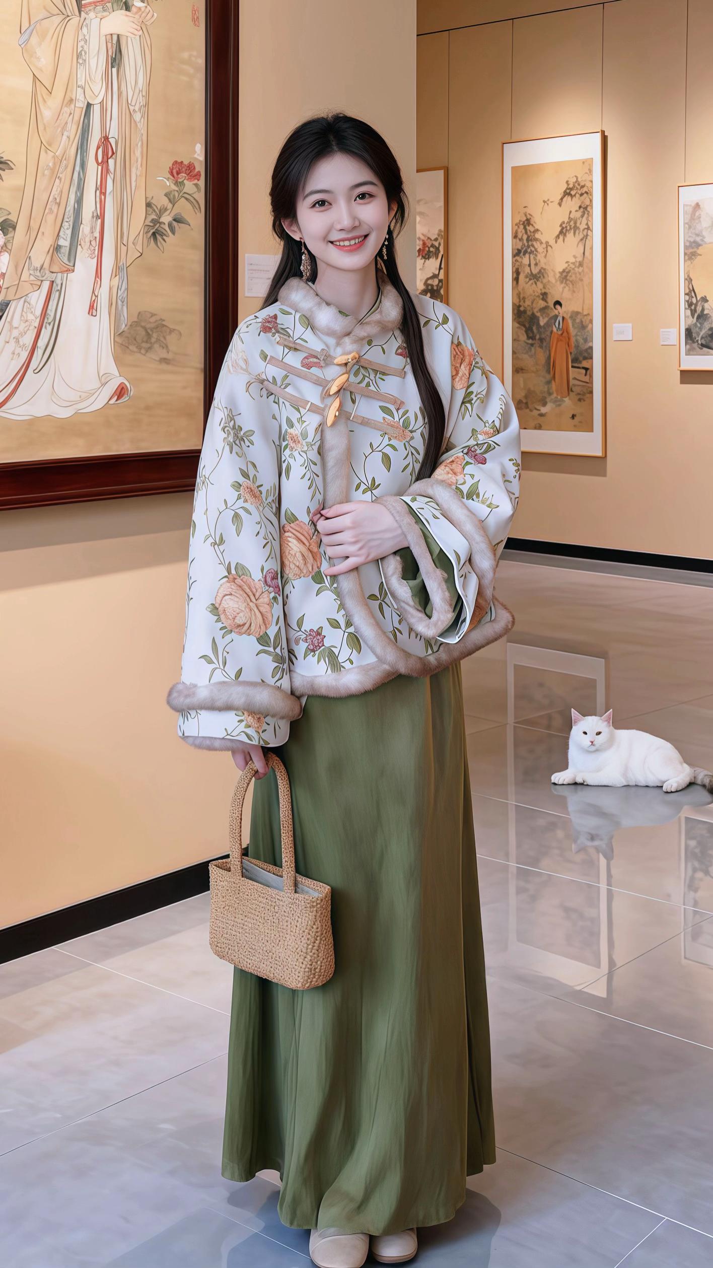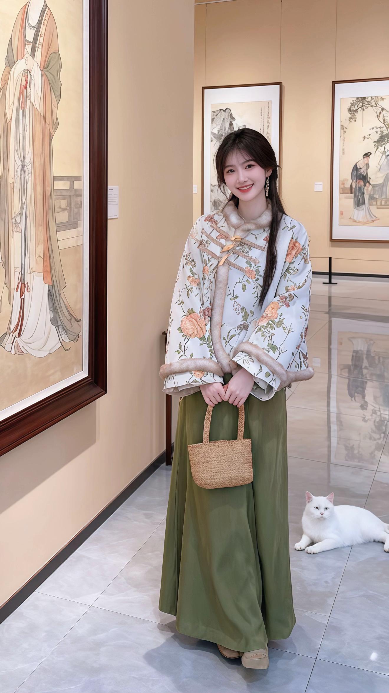 《当现代少女撞进古画里的东方诗意》林晚第一次在美术馆看见那幅《民国仕女图》时,心跳漏了一拍。画中女子身着米白绣花茶服,配豆绿长裙,眉眼间的温婉竟和她今天的穿搭意外重合。