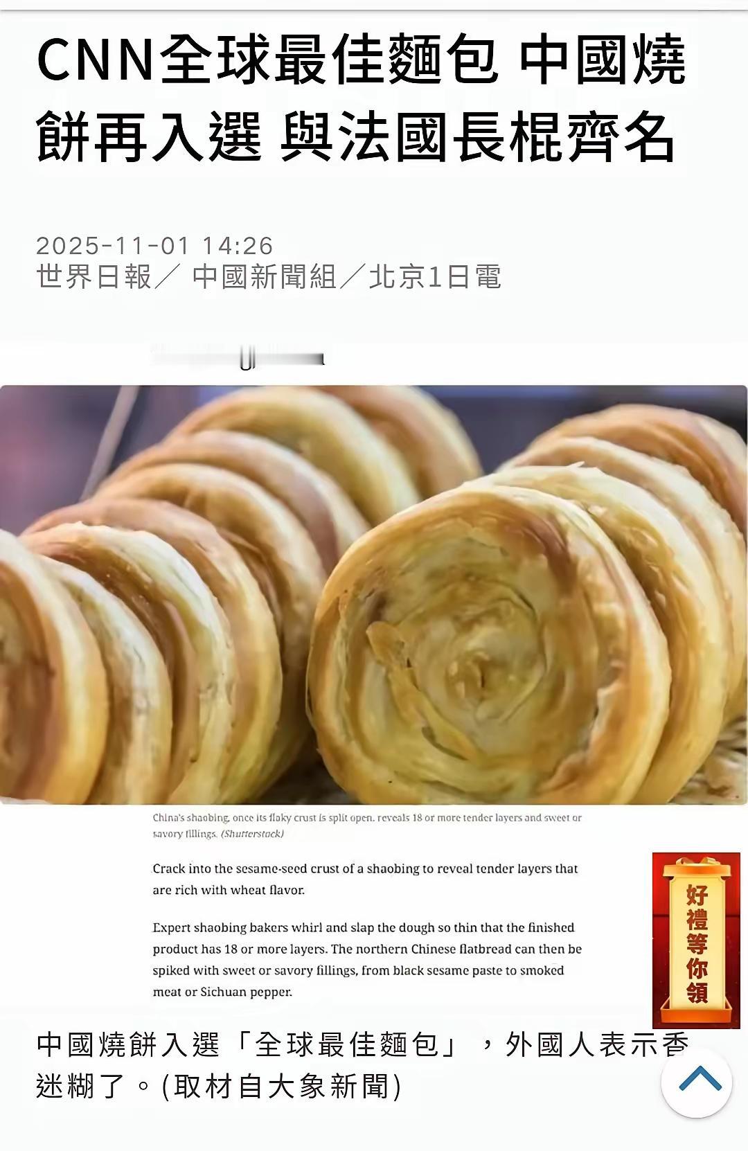 美国人还真是“山猪儿没吃过细糠”,一个烧饼就让他们投降了?最神奇的是它居然被放进了全球最佳,而且还是面包类别。[我想静静] 烧饼是烧饼,面包是面包。这在我们中国是有严格区分的。不要以为烤出来的都是面包,新疆还有烤包子呢。 当看到和法棍摆在一起的时候,我还是可以理解了。可能他们理解的面包就是法棍大列巴之类的吧。 要不这些山猪儿来中国尝尝蟹壳黄肉夹馍牛肉锅盔……现在我们有很好的免签政策哦。 点右上角关注我,我们一起去看这个魔幻的世界