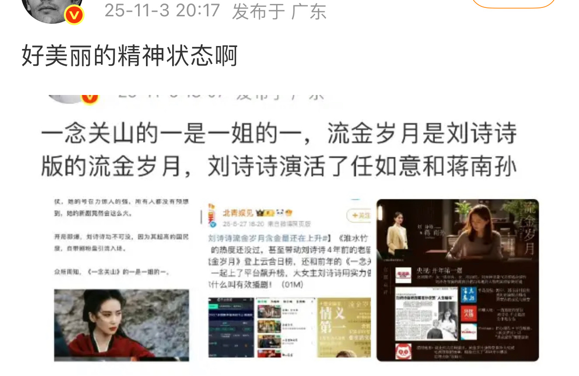 《流金岁月》《一念关山》,都是刘诗诗单扛,都是刘诗诗一番剧,这不是实话么?没想到下家们这么pf,是因为自家没有一番剧可以吹?[挖鼻]