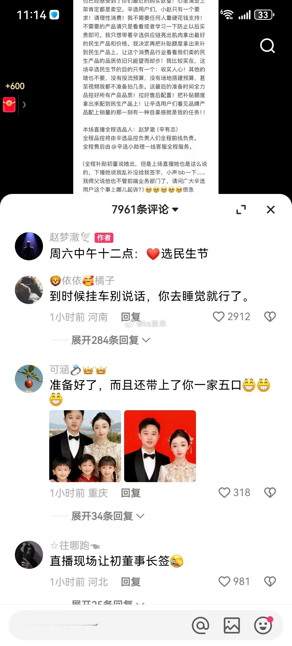赵梦澈发预热视频,强调民生节的选品辛巴全程参与,也强调售后辛选小助理一线客服全程服务!