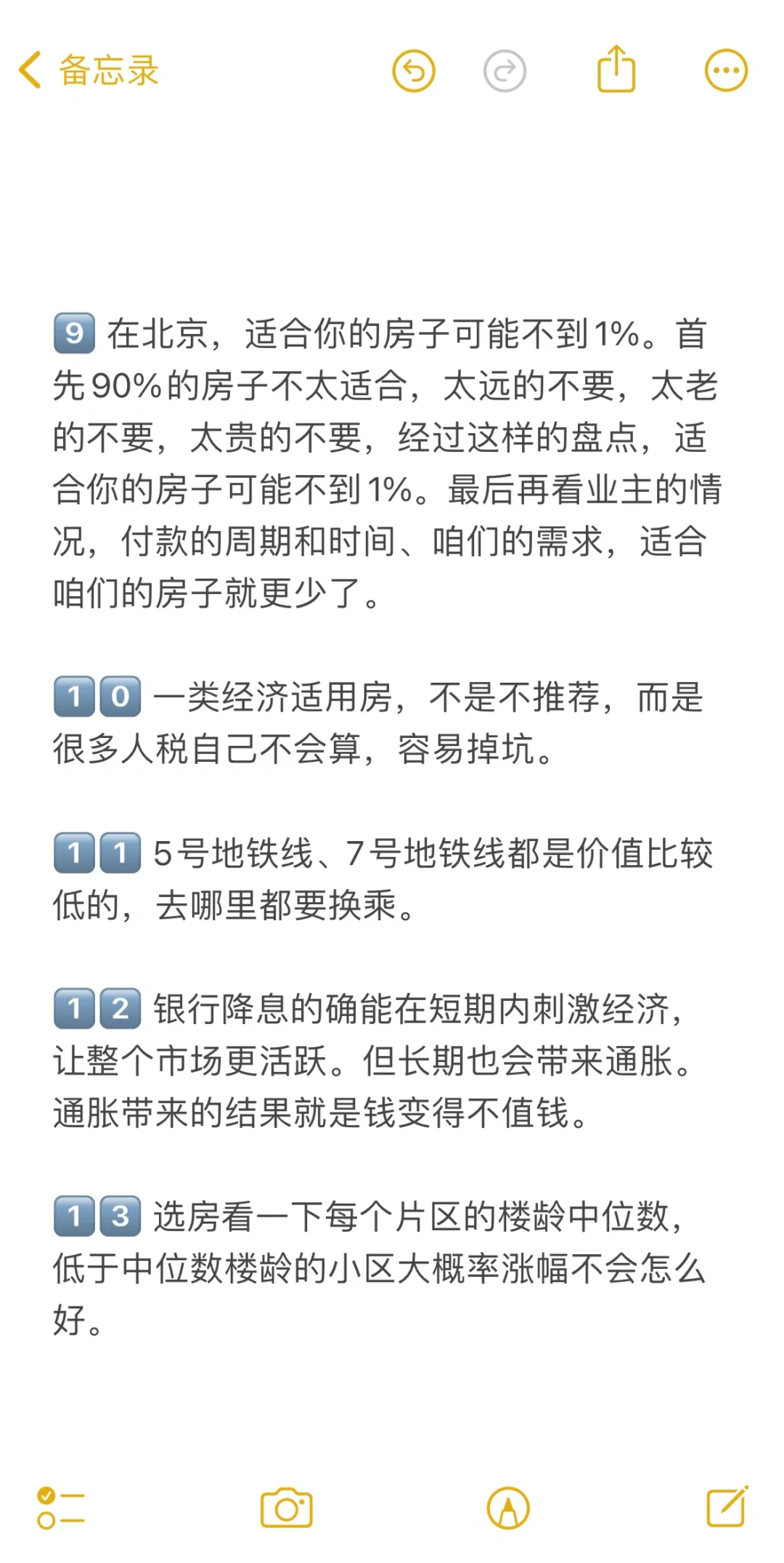 9️⃣ 在北京,适合你的房子可能不到1%。首先90%的房子不太适合,太远的不要,太老的不要,太贵的不要,经过这样的盘点,适合你的房子可能不到1%。最后再看业主的情况,付款的周期和时间、咱们的需求,适合咱们的房子就更少了。