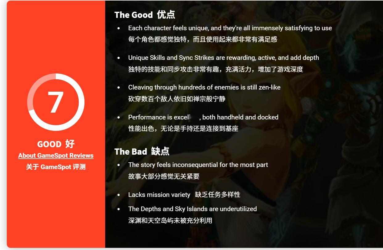 GS给出了7分并给出了游戏的优缺点,VGC认为游戏可能是迄今为止最严肃的《塞尔达无双说》系列游戏,但同时也是最具吸引力和回报感的战斗游戏。对于《王国之泪》的粉丝来说,看到其故事的一部分被重新讲述可能会感到不满,但支线剧情在一定程度上弥补了这一点。