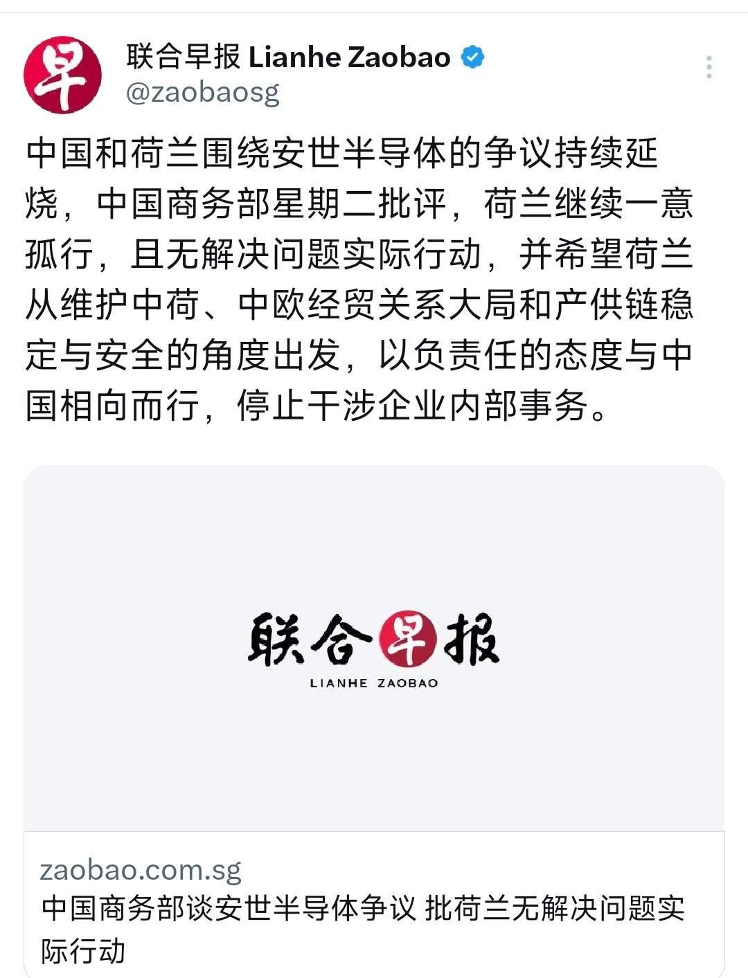 中国给荷兰发“最后通牒”,安世问题,一切责任都在荷方! 这相当于,从根子上否决了荷兰接管的合法性。也相当于告诉德、意等国,造成损失影响,找荷兰负责。 惹乱子的荷兰内阁已经倒台。咱们用词是“不当干预”,而不是“违法干预”!看来在给新内阁一个梯子,看你马车夫自己下来,还是被踹下来 前期以企业反制为主,现在中美关税谈判暂时休战,荷兰如果仍不思悔改,继续充当炮灰,那就怪不得我们了 #万能生活指南#