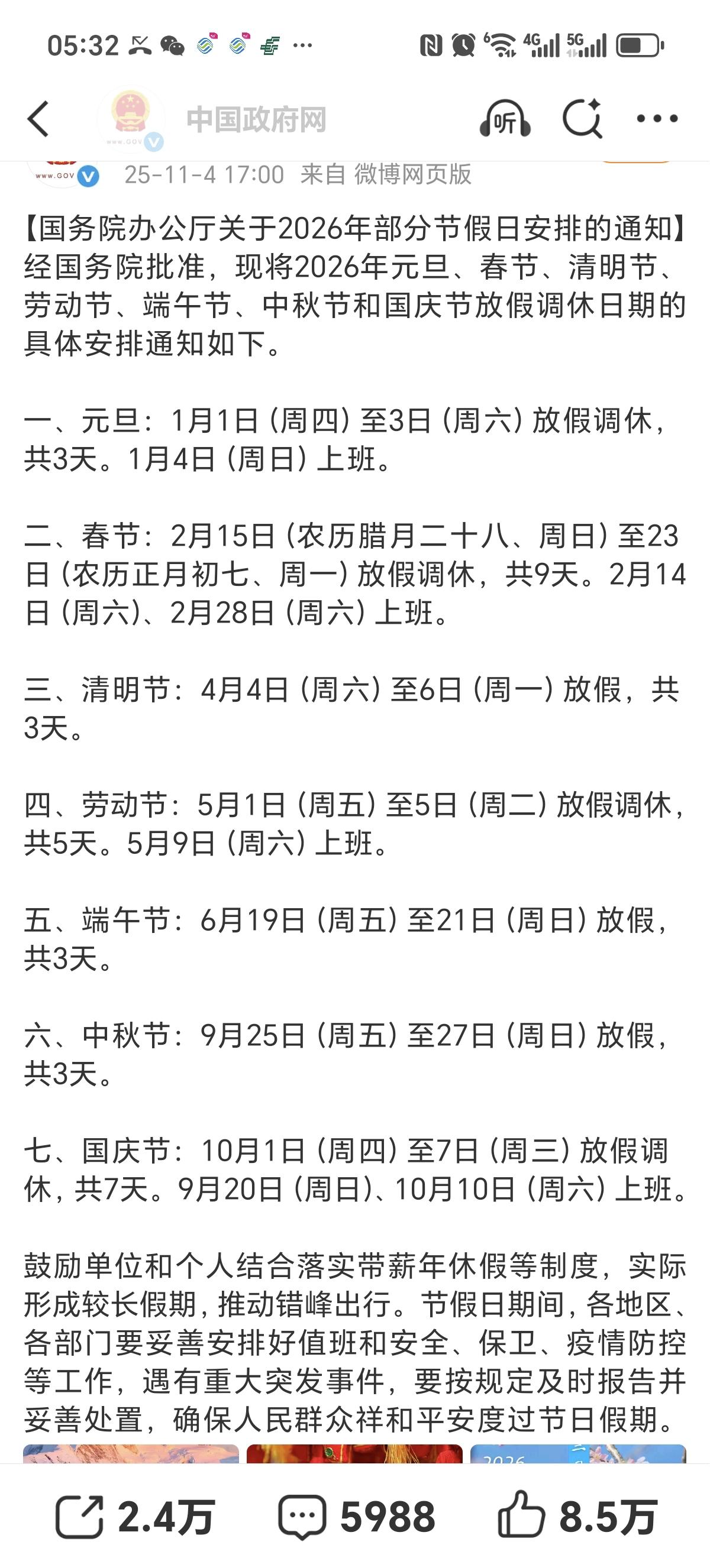 2026年假期安排!春节2月15日至2月23日,一共9天,2月14日和2月28日两个浪漫的日子上班! 五一劳动节五天,国庆节长假7天,有出行计划的可以早安排了! 1月、2月、4月、5月、6月、9月、10月都有假期。