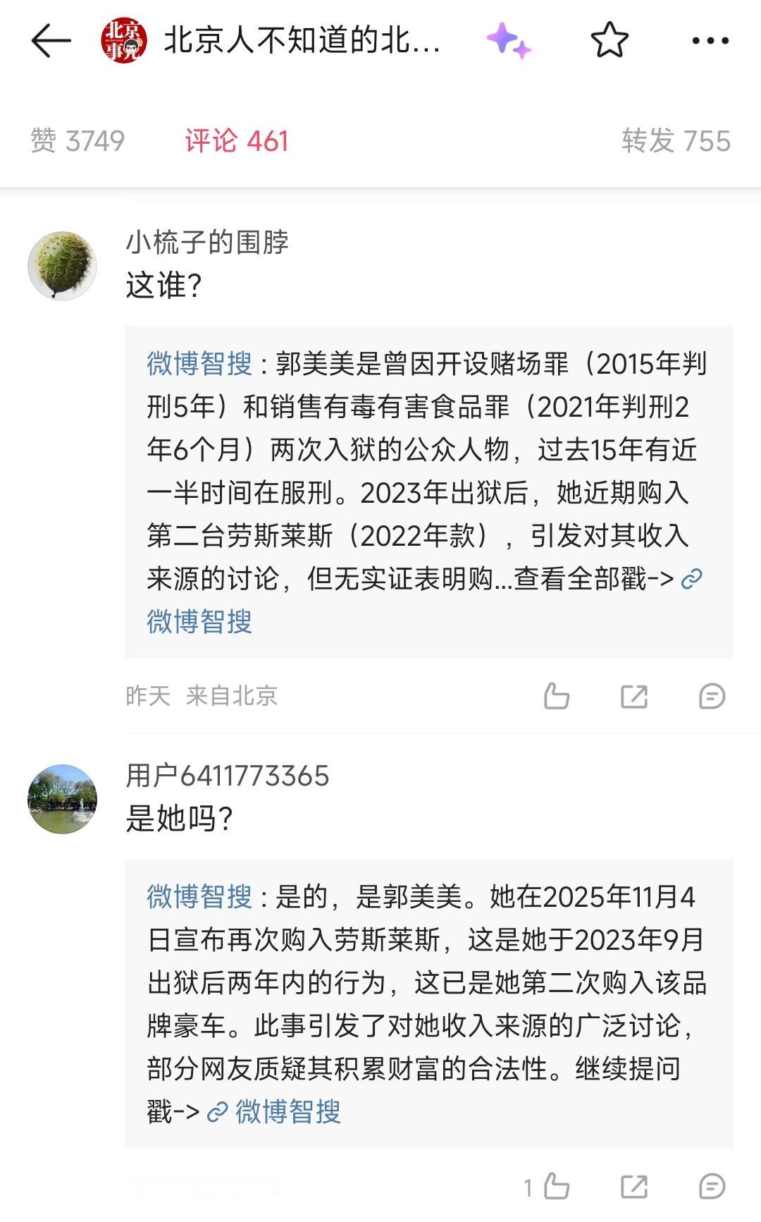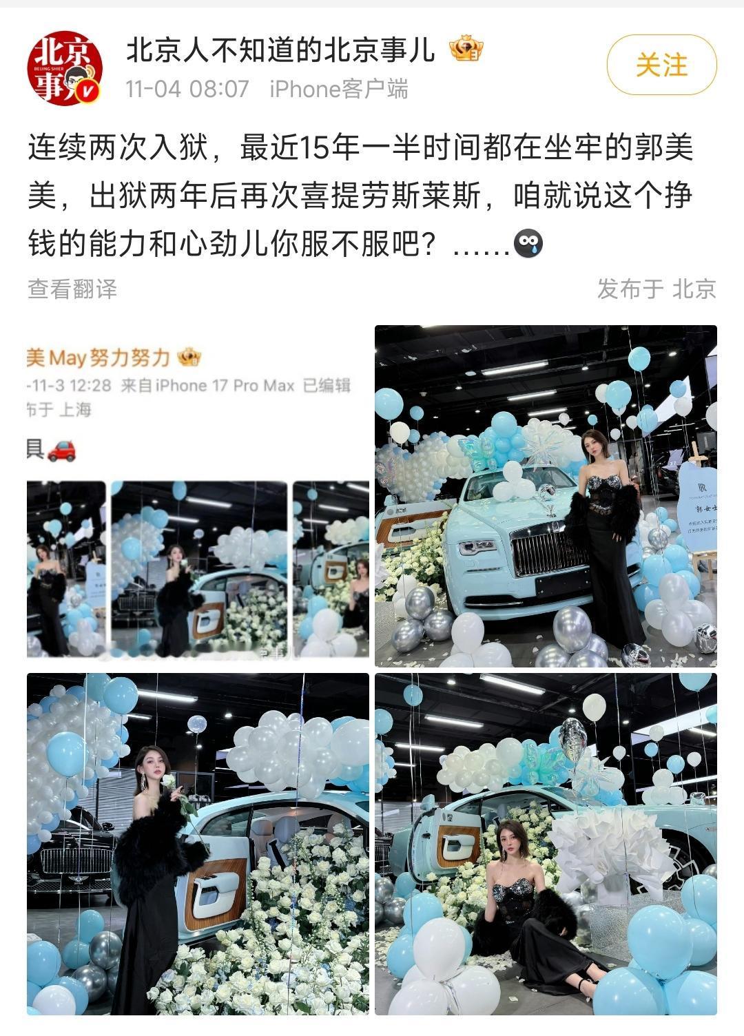 一大早就生了一肚子气 看网友爆料说连续两次入狱,最近坐牢七八年的网红郭美美出狱之后又提了一辆劳斯莱斯,并且还高调的在网上开自拍凹造型 咱不是说人家不能买这么贵的豪车,我就是纳闷儿,过去几年,她不就是一直在坐牢吗,又没有参加工作,到底哪来的这么多钱呀 以前开设赌场和销售有毒有害食品。 没有把她的家底给没收罚款吗 还是说出狱之后正赶上风口浪尖,做网红能这么赚钱?