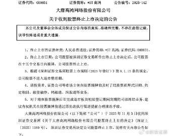 【ST高鸿终止上市 】*ST高鸿11月3日夜间发布公告称,公司于当日收到深圳证券交易所《关于大唐高鸿网络股份有限公司股票终止上市的决定》,决定公司股票终止上市。公司股票在2025年9月1日至9月26日期间,连续二十个交易日的股票收盘价均低于1元,触及交易类强制退市情形。公司股票不进入退市整理期,将于被作出终止上市决定后十五个交易日内摘牌。公司已与太平洋证券签订《委托股票转让协议》,聘请其为代办机构。