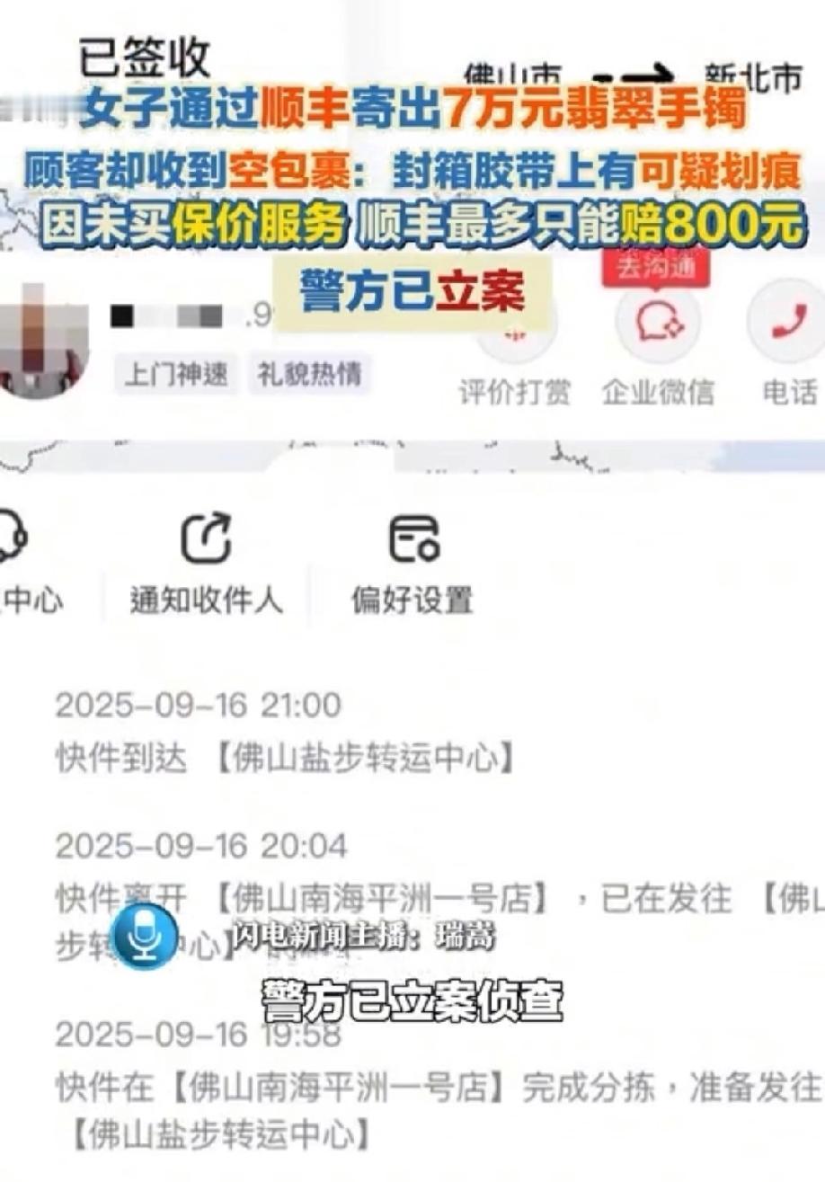 广东,女子把价值7万元的翡翠手镯通过快递寄给顾客,不料,顾客收到快递后,发现里面的手镯不翼而飞,只剩了一个空箱子,包裹上封箱胶带也有被划开的痕迹的。女子认为手镯肯定是在运输途中被偷,于是找快递公司讨要说法,快递公司却表示,女子没有保价,最多赔偿800元。双方僵持不下,女子选择报警求助。 黄女士做了多年的珠宝生意,如今却被快递摆了一道,搞的她实在是寝食难安。 她想不通,好好寄出去的7万元翡翠手镯,客户收到的竟是个空箱子,手镯到底去哪了。 这只手镯品相非常好,是黄女士9月4日才淘到手的,当初一共支付了7.8万元,其中手镯7万元整,其余货物0.8万元。 好货不愁卖,手镯到店里没几天,9月16日,有个顾客联系黄女士,想要购买这个手镯。 黄女士本想着这单生意能顺顺利利赚点钱,却不料手镯在运输途中消失不见。 下单当天,黄女士小心翼翼地把这副手镯打包好,里三层外三层缠得严严实实,生怕运输中出岔子,随后交给快递公司寄往台湾省新北市的客户手中。 看着物流信息一步步更新,黄女士一开始还挺放心。 9月16日下午3点多包裹被揽收,晚上10点半到了佛山盐步转运中心,17日凌晨1点多在深圳操作中心完成分拣,上午9点多开始通关,10点多就到了中国台湾关务组。 可就在她以为客户很快就能收到货、马上就能收尾款的时候,一个晴天霹雳砸了下来。 原来,客户打来电话,语气满是疑惑和无奈,说收到的包裹是空的,里面压根没见翡翠手镯的影子,而且包裹上的封箱胶带还有明显被划开的痕迹。 黄女士一听这话,脑袋“嗡”的一下就懵了,7万元的东西说没就没了?第一次听说快递这么不靠谱。 她赶紧去查包裹的称重记录,这不查不知道,一查更揪心了:9月16日晚上9点前,包裹在佛山盐步转运中心称重是0.68千克,可到了17日早上10点多,重量就变成了0.32千克,足足少了一半还多。 有了这些初步的证据,黄女士立马联系快递公司讨要说法,她觉得手镯丢了就是快递方的责任,毕竟包裹全程都在他们的掌控之下。 可快递公司的回复让她彻底寒了心。 对方表示,黄女士寄件时没购买保价服务,按照公司规定,最多只能赔偿800元。 7万和800,这差得也太远了,黄女士根本没法接受,快递公司摆明了是监守自盗。 双方就赔偿金额反复协商,可始终谈不拢,一直僵持不下。 没办法,黄女士只能选择报警求助,以盗窃为由报了案。 她心里又焦虑又期待,焦虑的是怕找不到偷手镯的人,钱货两空;期待的是警方能尽快查明真相,帮自己追回损失。 眼看事情要闹大,涉案寄件站点的负责人承认这确实也是他们的责任,还表示公司内部正在调查,暂时没确定是哪个环节出了纰漏,总部也已经联系了当地派出所。 目前,这起翡翠手镯遗失案已经被警方立案侦查,手镯的去向还得等民警的侦查结果。 从法律角度而言,手镯在运输途中丢失,快递公司已经构成违约。 《民法典》第八百三十二条规定,承运人对运输过程中货物的毁损、灭失承担赔偿责任。 但是,承运人证明货物的毁损、灭失是因不可抗力、货物本身的自然性质或者合理损耗以及托运人、收货人的过错造成的,不承担赔偿责任。 黄女士将翡翠手镯交付快递公司寄往台湾省新北市,双方已成立合法有效的快递运输合同,快递公司作为承运人负有将货物安全送达约定地点的义务。 包裹存在封箱胶带被划开的痕迹,且称重记录显示从佛山盐步转运中心的0.68千克降至中国台湾关务组的0.32千克,重量大幅减少,结合客户收到空包裹的结果,可明确货物在运输途中发生灭失,依法应当承担赔偿责任。 其次,快递公司以没保价为由仅赔偿800元,明显不合理。 《快递暂行条例》第二十七条规定,快件延误、丢失、损毁或者内件短少的,对保价的快件,应当按照经营快递业务的企业与寄件人约定的保价规则确定赔偿责任;对未保价的快件,依照民事法律的有关规定确定赔偿责任。 该条例并未明确未保价快件的具体赔偿限额,而是指向民事法律规定,不能直接依据企业内部规定限制赔偿责任。 结合《民法典》公平原则,若仅赔偿800元,与7万元的货物实际价值相差悬殊,明显违背权利义务对等原则。 黄女士已提交采购记录、交易凭证等证明手镯价值,有权要求快递公司按实际损失承担赔偿责任,而非受限于800元的限额。 大家认为,这个手镯到底去哪了呢?