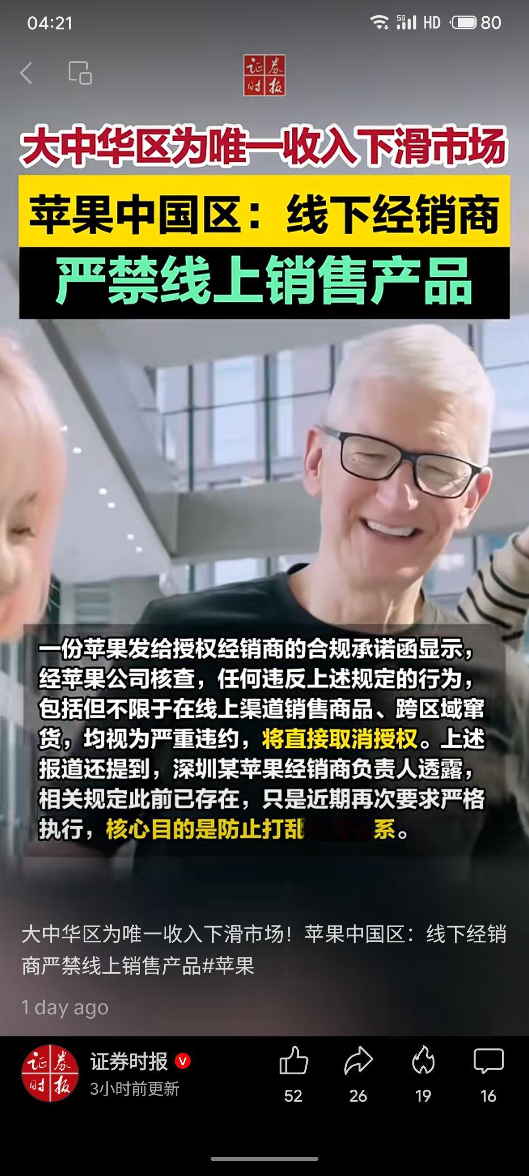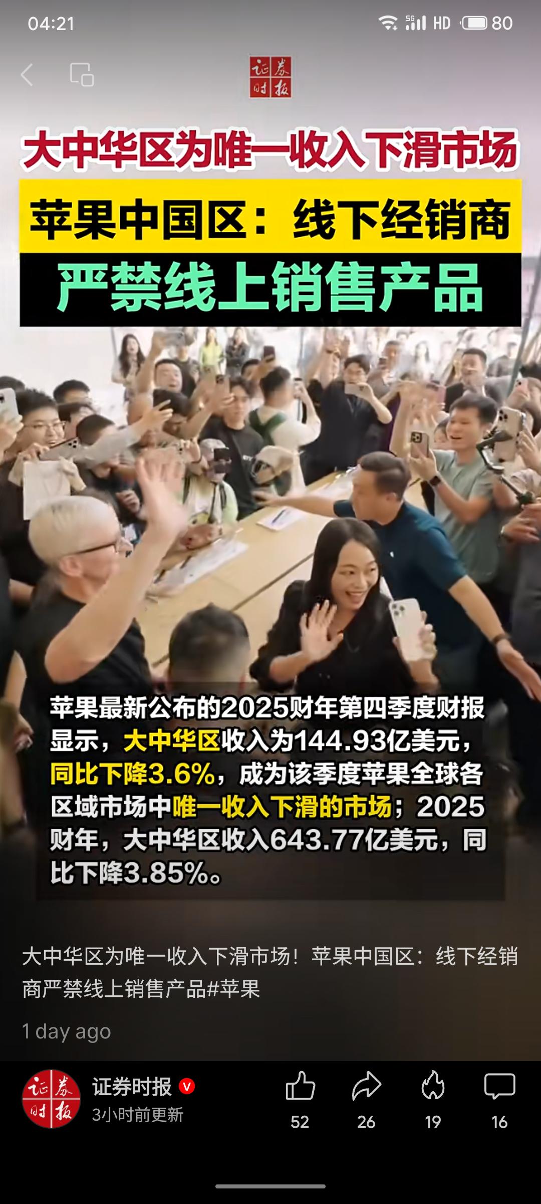 面对大中华区成为苹果全球唯一收入下滑的市场(2025财年Q4收入144.93亿美元,同比下降3.6%),苹果中国区近期重申并严格执行规定,严禁所有线下授权经销商在电商、社交及直播等线上平台销售或展示产品,旨在维护价格体系、防止跨区域窜货。违规者将面临直接取消授权的严厉处罚。