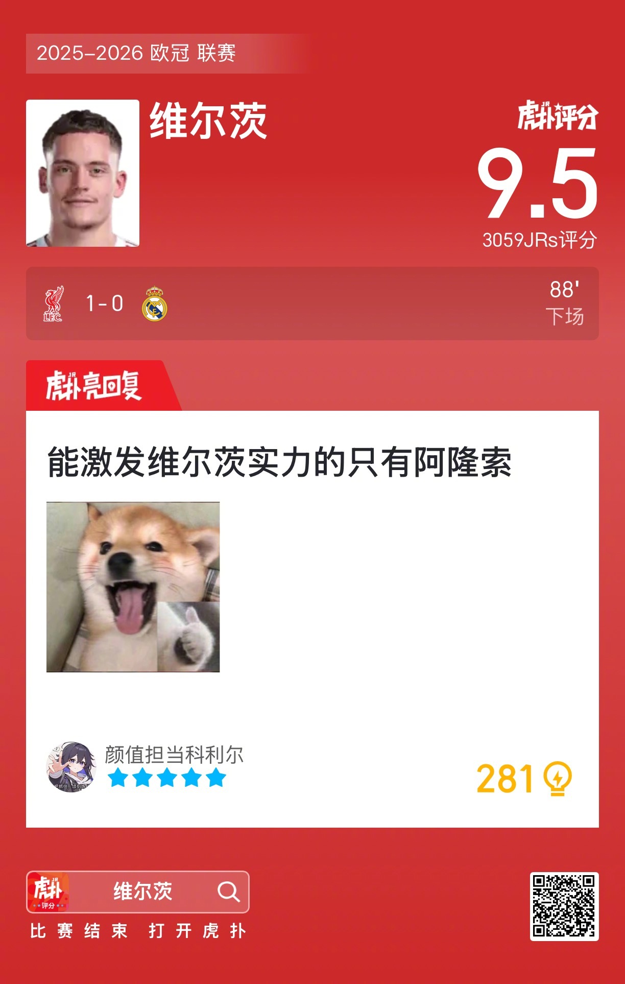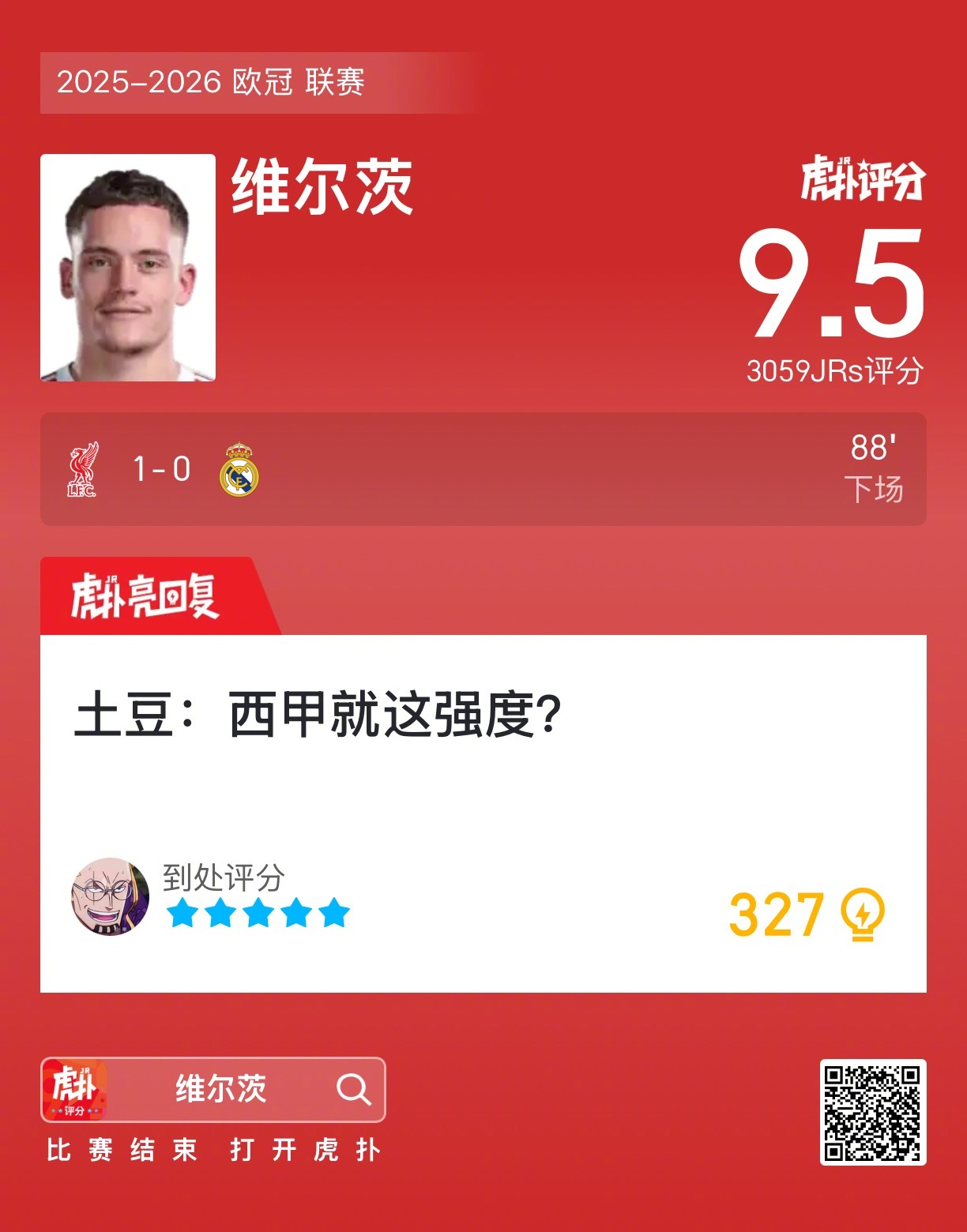 利物浦1比0皇马维尔茨赛后收获9.5的虎扑评分!