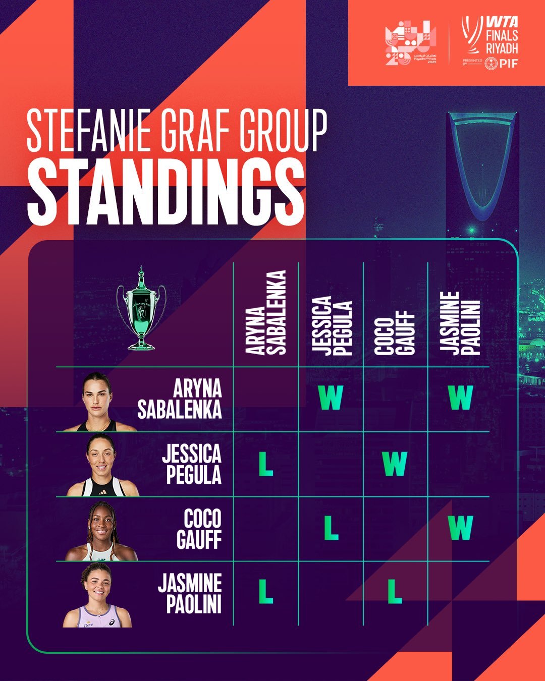 小组赛前两轮战罢之后,萨巴伦卡以2胜0负排名第一,高芙和佩古拉都是1胜1负,鲍里妮0胜2负提前出局,格拉芙组的两个出线名额都将在最后一轮决定,三人仍有可能形成“连环套”的局面[震惊]萨巴伦卡高芙佩古拉大乱斗
