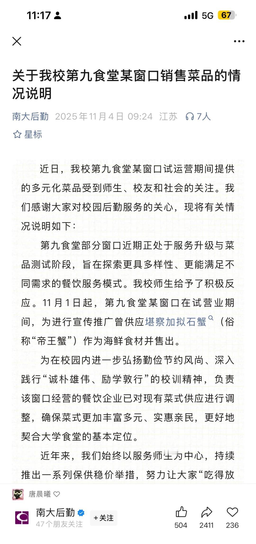 作为南大学生谈谈帝王蟹 最近南大九食堂帝王蟹这件事很火,网上多数媒体持批评态度,出乎意料的是我认识的基本上所有的南大学生都是支持这件事的。因此想要谈谈这件事,从各方的背景来谈,先说结论,食堂推出帝王蟹是聪明的举动,但是之后大概率不会继续提供。 虽然食材很特殊,价格很高昂,但是被如此大肆讨论其实没有意义。首先不管是批评也罢支持也罢都是站在学校的角度,谈论会不会有悖于学校“嚼得菜根”的校训,带动阶级对立之类上价值,学生支持也是将这是学校改革创新如何如何。事实上虽然食堂是学校的一部分,但是菜品的推出是独立的选择,可能校方得知这件事都在学生之后。那谈论学校怎么怎么做就没什么意义了。食堂肯定也没想到会引起这么大的舆论,它推出这道菜品只是出于商业目的宣传新食堂开业或者借着挑战杯的热点罢了。如果我是食堂运营的人我也会这么做,因为我的目的是赚钱。所以说这是聪明的营销手段。 那现在谈谈学校。学校可能最后才知道这件事,懵了,看见网上舆论这么多,大多还是批评。如果你是学校管理者你会怎么办。学校的所有举措与制度说得难听点并不是真的为了学生而是为了维持稳定,维持这个大的组织的正常秩序,为学生创新服务是一个口号,是捎带着去做的事。前几天挑战杯学校做了那么多创新得到外界一致好评但是被校内学生喷惨了就能看出学校的目的是让外界觉得如何而不是真正让本校学生觉得如何。虽然让外界和本校都说好有时并不矛盾但依旧有优先级。当舆论和创新冲突时,哪怕自家学生支持,只要外界有反对声音,学校会立刻制止这件事,因为它不敢担这个风险。虽然我是南大的学生,也很爱这个学校,但我不会把创新菜品的功劳归于学校,今早学校后勤发通知虽没明说但是感觉意思上就是今后没有这道菜了,我也不会因为学校的认怂去喷学校。 这件事本质上就是一个食堂自己的举措,借着挑战杯的热度与这道菜的新鲜劲莫名其妙火起来的乌龙,和学校本身我感觉没半毛钱关系。站在学生角度我认为食堂没错,带动菜品创新的趋势,而且看别人吃也挺有乐子。站在学校角度我感觉也没错,不要把学校想的多么伟大高尚全知全能,它就是一个维持秩序的管理组织,我如果是管理者我也会选择最稳妥的处理方法。至于帝王蟹和阶级关系,和很高的价值观意识形态之类的观点,或许帝王蟹都没想到自己有那么大的能量吧。 欢迎各种冷静的观点交流帝王蟹 食堂 大学食堂 热点