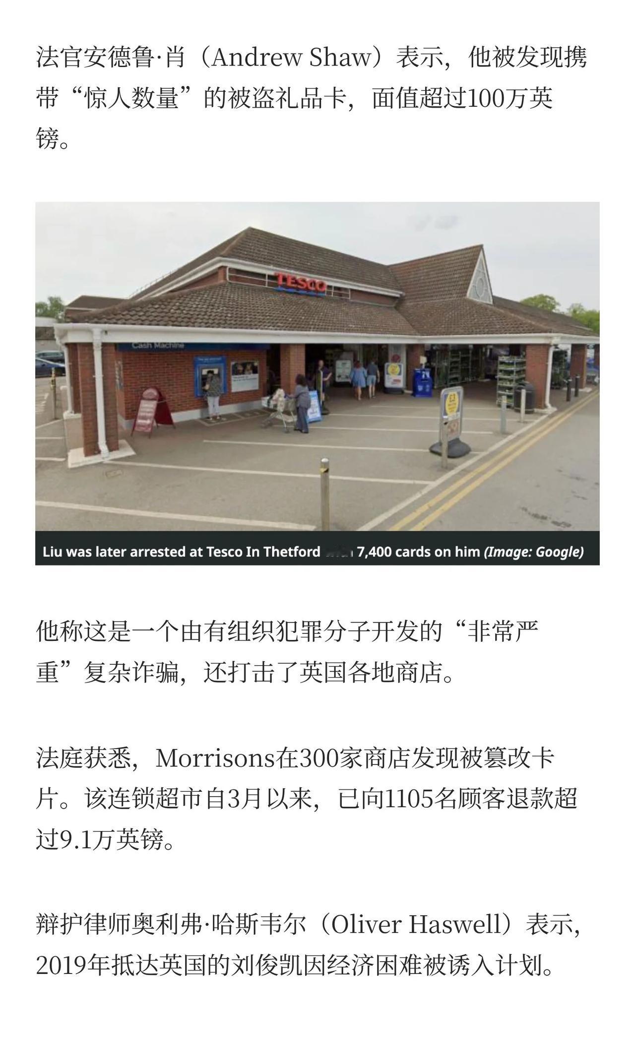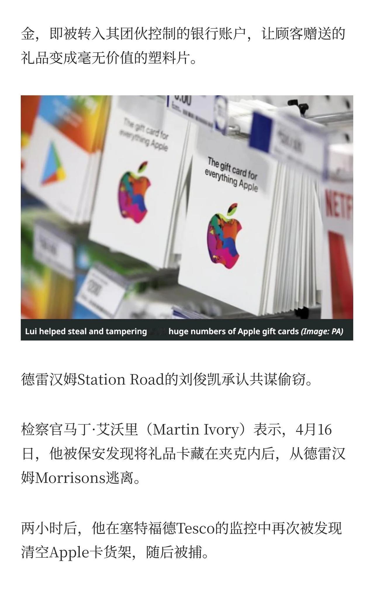 中国男子参与100万英镑礼品卡诈骗被监禁 26岁的刘俊凯(Junkai Liu)在访问德雷汉姆(Dereham)的Morrisons和塞特福德(Thetford)的Tesco后,被抓获携带超过7400张被盗Apple礼品卡,每张价值高达250英镑。曼彻斯特 新闻 生活 伯明翰 英国工作 英国留学生 海外 伦敦生活 伦敦 英国