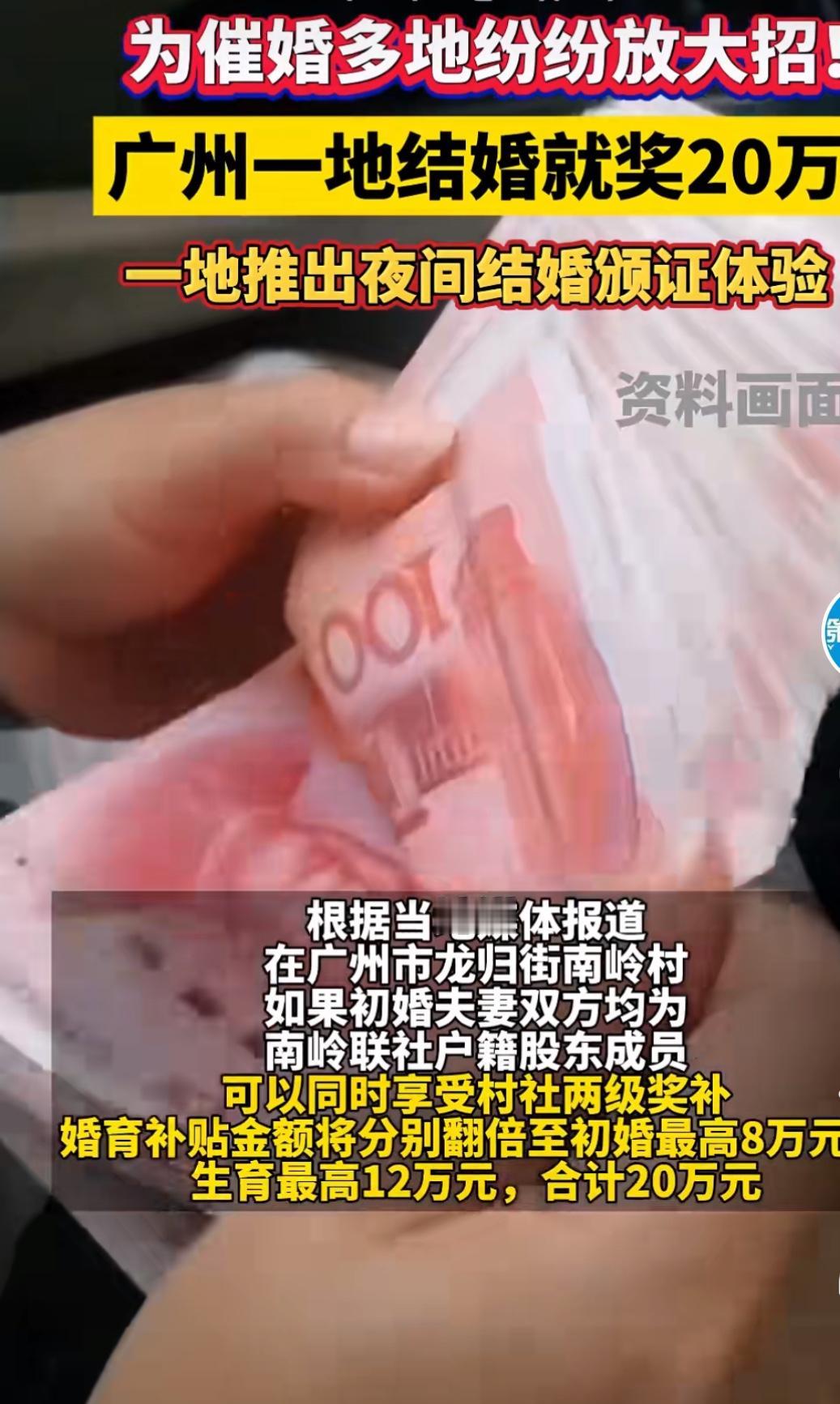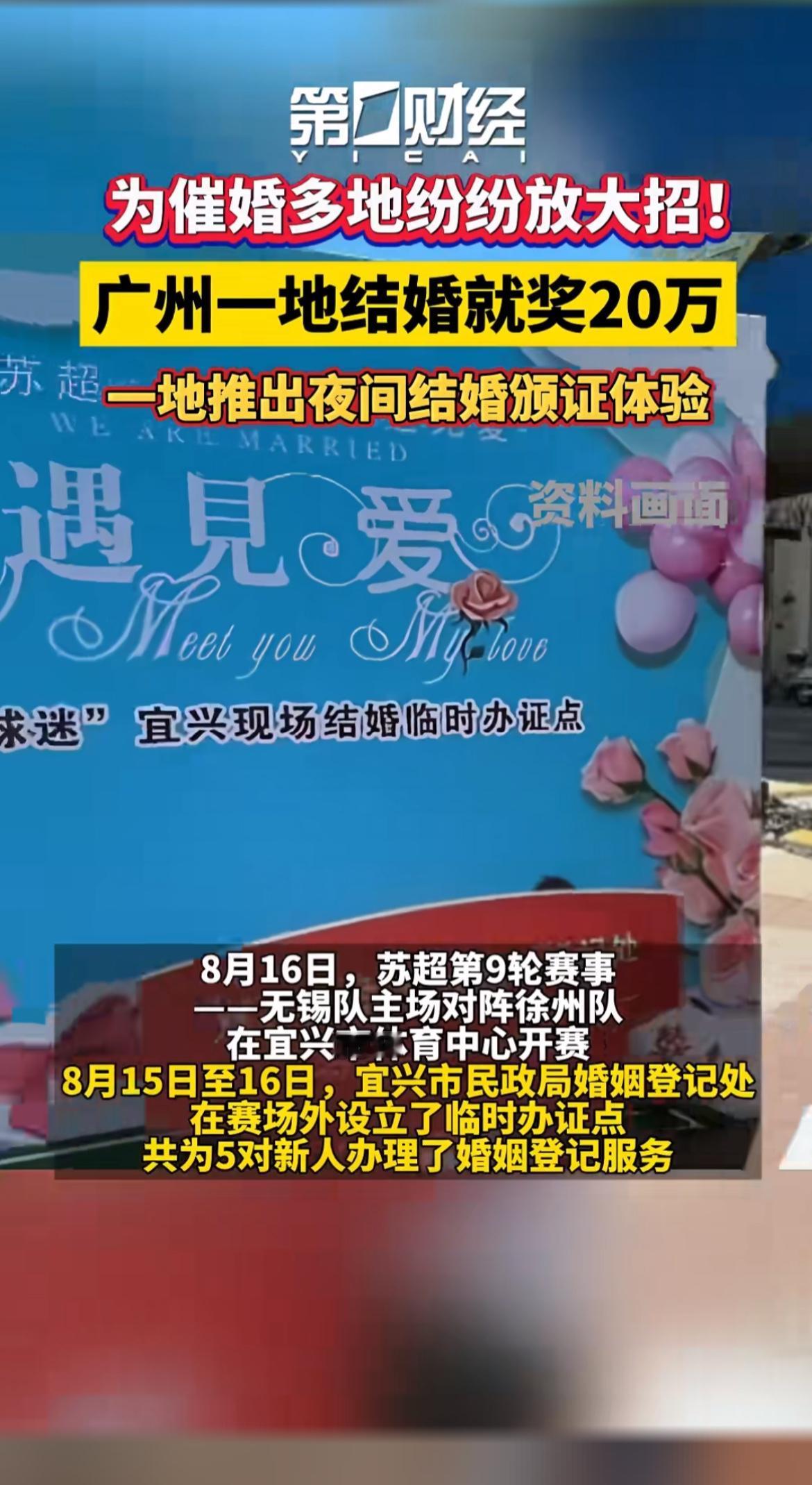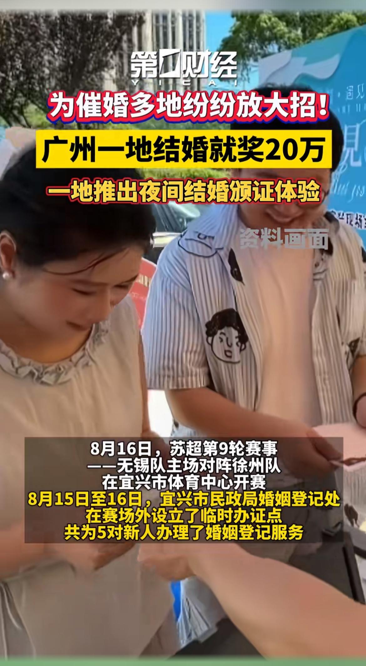 现在各地为了“催婚”真是放大招了!广州一地结婚加生育最高奖励20万,这诱惑可不小。不过有单身小伙觉得,奖励虽多,但养娃成本更高,不想生的人还是会观望。 除了广州,上海黄浦区也在婚姻登记服务上不断创新。11月14日至22日的每周五周六,黄浦区民政局和INS新乐园推出夜间结婚颁证体验项目,还有新人专属管家服务。而且活动和世界级电音盛会联动,成功预约的新人有机会获赠专属门票。现在结婚领证场景越来越多样,宜兴的现场体验又会有啥惊喜呢?