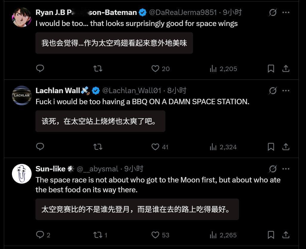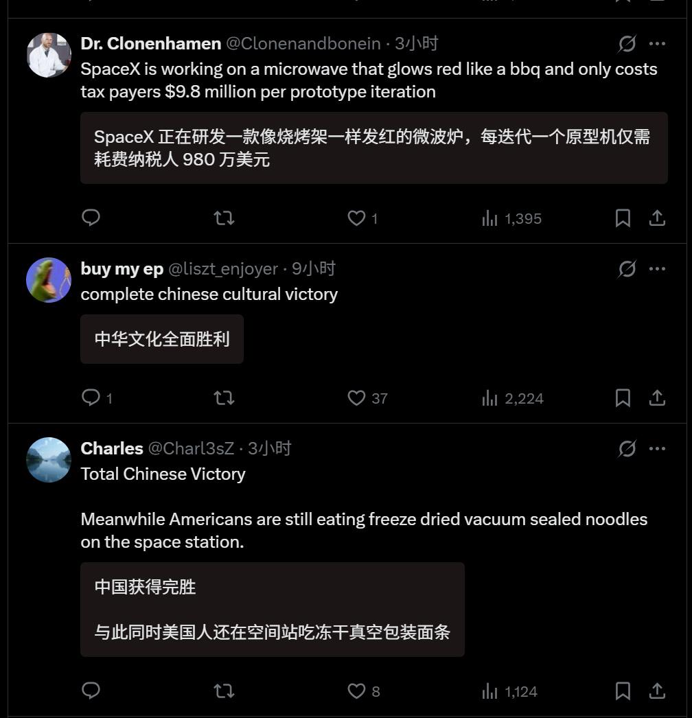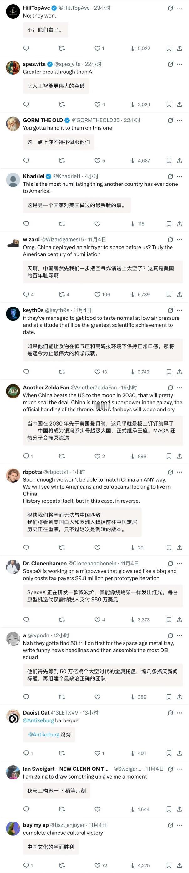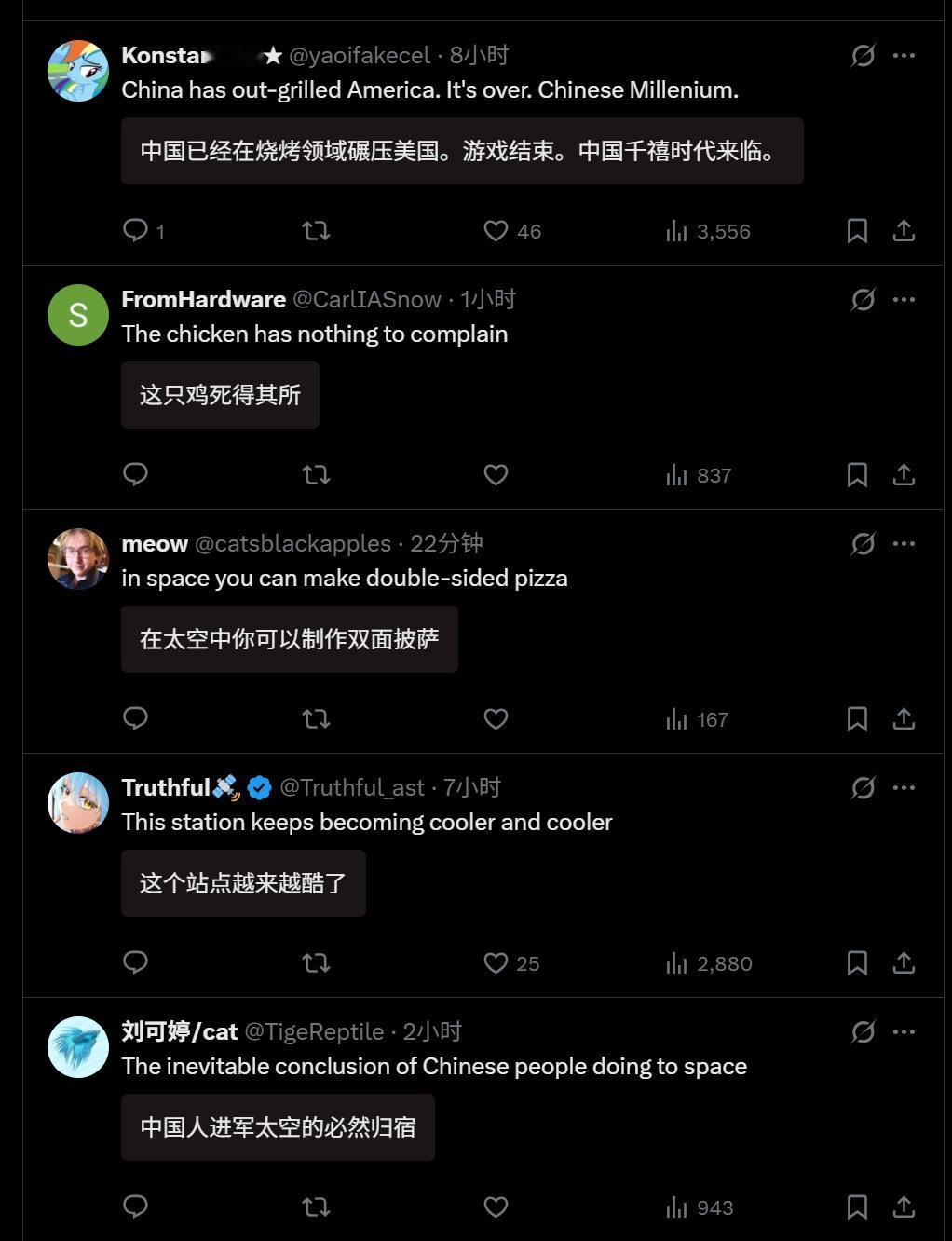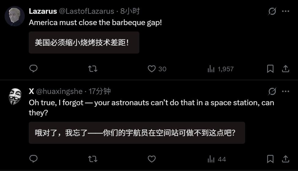 有多少中国人疯狂吹捧spaceX的猎鹰、星舰和星链,就有多少美国人疯狂吹捧中国的空间站。我国在低成本火箭上离spaceX有多大的差距,在空间站上就有多大的领先优势。 我国在空间站秀了下烧烤,星舰连续发射成功了好几次。 我国有一大批初创公司是spaceX的追赶者:蓝箭航天、天兵科技、东方空间、中科宇航、星际荣耀、星河动力、深蓝航天、零壹空间、天仪研究院,等等。 美国也有不少初创公司以中国的空间站为追赶目标:公理太空、蓝色起源、塞拉空间(SierraSpace)、太空旅行者、无限太空(VastSpace),等等,波音、洛马和空客也都规划了自己的空间站项目。 空间站和spaceX,中美航天目前各胜一局打平。就看第三个项目——登月了,谁能先登月,谁就能在航天领域遥遥领先。