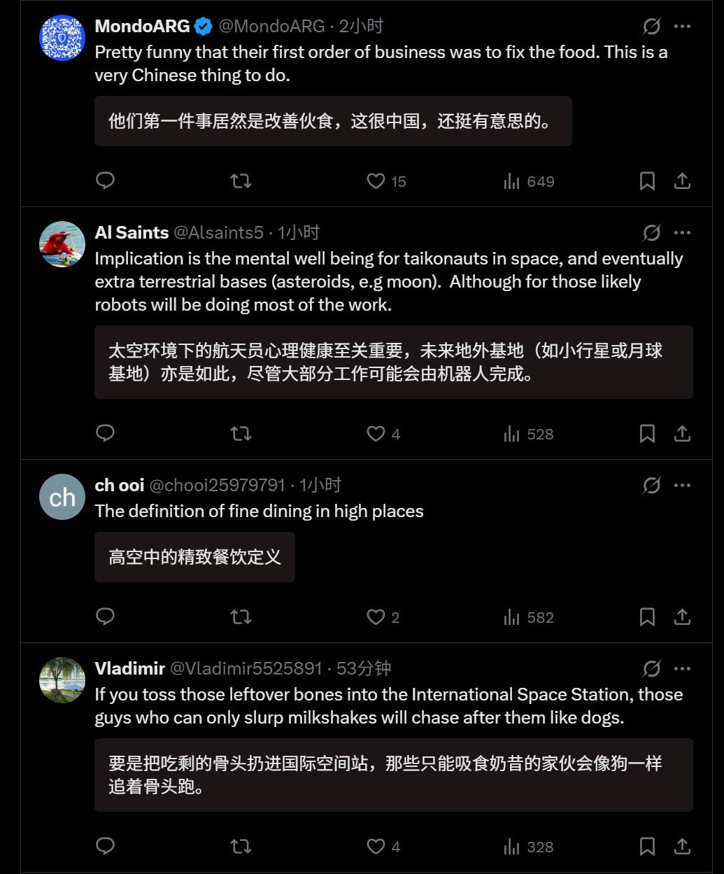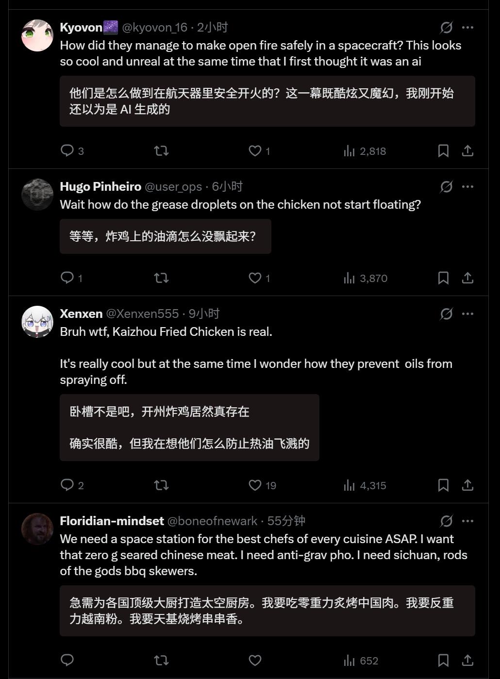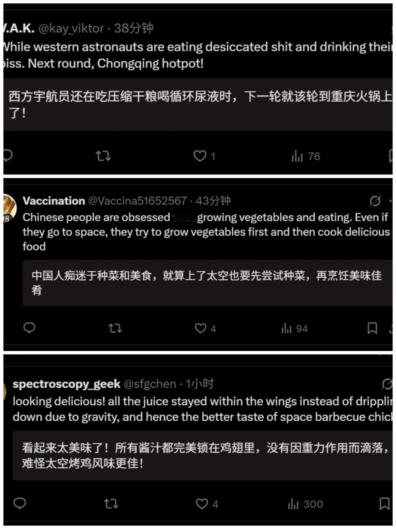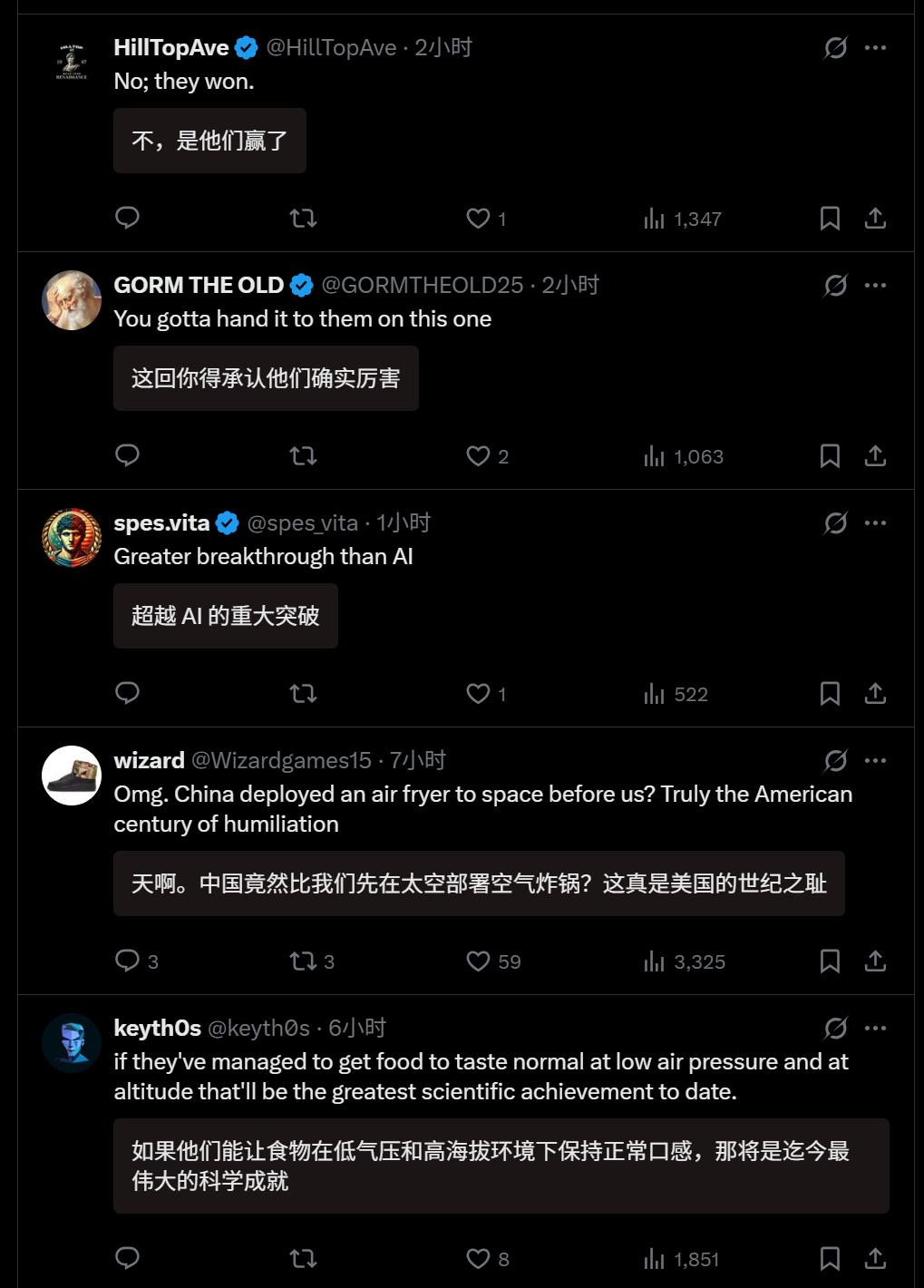 有多少中国人疯狂吹捧spaceX的猎鹰、星舰和星链,就有多少美国人疯狂吹捧中国的空间站。我国在低成本火箭上离spaceX有多大的差距,在空间站上就有多大的领先优势。 我国在空间站秀了下烧烤,星舰连续发射成功了好几次。 我国有一大批初创公司是spaceX的追赶者:蓝箭航天、天兵科技、东方空间、中科宇航、星际荣耀、星河动力、深蓝航天、零壹空间、天仪研究院,等等。 美国也有不少初创公司以中国的空间站为追赶目标:公理太空、蓝色起源、塞拉空间(SierraSpace)、太空旅行者、无限太空(VastSpace),等等,波音、洛马和空客也都规划了自己的空间站项目。 空间站和spaceX,中美航天目前各胜一局打平。就看第三个项目——登月了,谁能先登月,谁就能在航天领域遥遥领先。