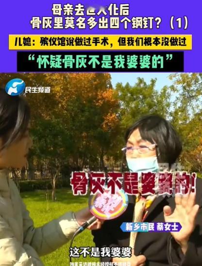 河南,90岁的老人去世,从未做过手术的她,骨灰里却出现了四根钢钉,家属怀疑工作人员弄错了。可对方调取监控后,称流程一环扣一环,不会有错。但家属发现在发放骨灰时,监控缺失了两分多钟,认为这里面有蹊跷,可对方却说只是线路老化而已,这让家属无法接受。家属已经报警,要找回婆婆真正的骨灰。 “我婆婆这辈子连手术都没做过,这些钢钉到底是从哪儿来的?” 蔡女士的婆婆经历过战乱、饥荒和那些动荡岁月,虽然常年卧病在床,但是医院的既往病史中写的很清楚:无手术史,但如今骨灰里却出现了明显属于内固定器械的钢钉。 “我们的流程绝对规范。”尽管殡仪馆工作人员反复强调着“一环扣一环”,不可能会出错,可当家属要求查看火化结束后的完整录像时,屏幕上的时间突然出现了一段大概140秒的空白,恰好覆盖了从火化炉出来到发灰处的关键环节。 “你说是线路老化?”儿子红着眼睛质问,“那为什么偏偏在这个节骨眼上老化?”而属于母亲的其他的监控画面却完好无损。就是这段短暂的缺失,让所有看似严谨的流程都变得可疑。 在传统文化中,保留完整的遗骨是子孙尽孝的象征。蔡女士记得母亲生前最怕火葬,老人总说“留着全尸才能认祖归宗”。为了减轻她的恐惧,家人们特意约定要亲眼见证整个火化过程。 如今,这些来历不明的钢钉指向三种可能:要么是医院留下了未被发现的医疗事故,要么是殡仪环节出现了不可告人的混淆,最让家属害怕的,是这些钢钉可能根本不属于他们的母亲。 “具体过程我们员工实在是记不清了!”殡仪馆给出的这个说法,实在是让蔡女士和丈夫有火都没地方发。 但他们记得母亲生前喝药时怕苦的模样,记得她躺在床上仍坚持把孙子给的零花钱仔细收好的动作,更记得母亲最后被推进火化炉前的样子。 工作人员的“记不清”,或许只是每日重复劳动中的一次寻常遗忘,可对家属而言,却是关于母亲最后归宿的全部真相,就这样断在了这缺失的140秒和这句含糊的解释里。 目前,蔡女士和丈夫已经报警,也考虑做DNA鉴定,当地有关部门也已经组织人进行调查。 事情发生后,邻居们偶尔会议论,有人说这家人太执着,让老人走了都不安生;也有人偷偷叹气,说要是哪天轮到自己,会不会也遭遇这么一桩“糊涂事”。 只能说,这场寻找,不仅拷问着生命最后一程的尊严,也衡量着服务行业中那句“规范”背后,应有的温度与责任。对于蔡女士一家而言,无论结果如何,他们都要为老人,讨回一个明明白白的交代。毕竟,生命的来去,容不得半点“记不清”。 信源: 河南民生频道——11月4日(发布)河南新乡,母亲去世后火化后 骨灰里莫名多出四个钢钉?儿媳:殡仪馆说做过手术,但我们根本没做过,“怀疑骨灰不是我婆婆的” 文|一阳 编辑|史叔