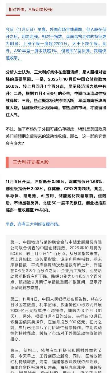 【三大利好支撑A股 】A股相对外围明显较强 相对外围,A股明显较强!今日(11月5日)早盘,外围市场全线暴跌,但A股在低开之后,明显走强。