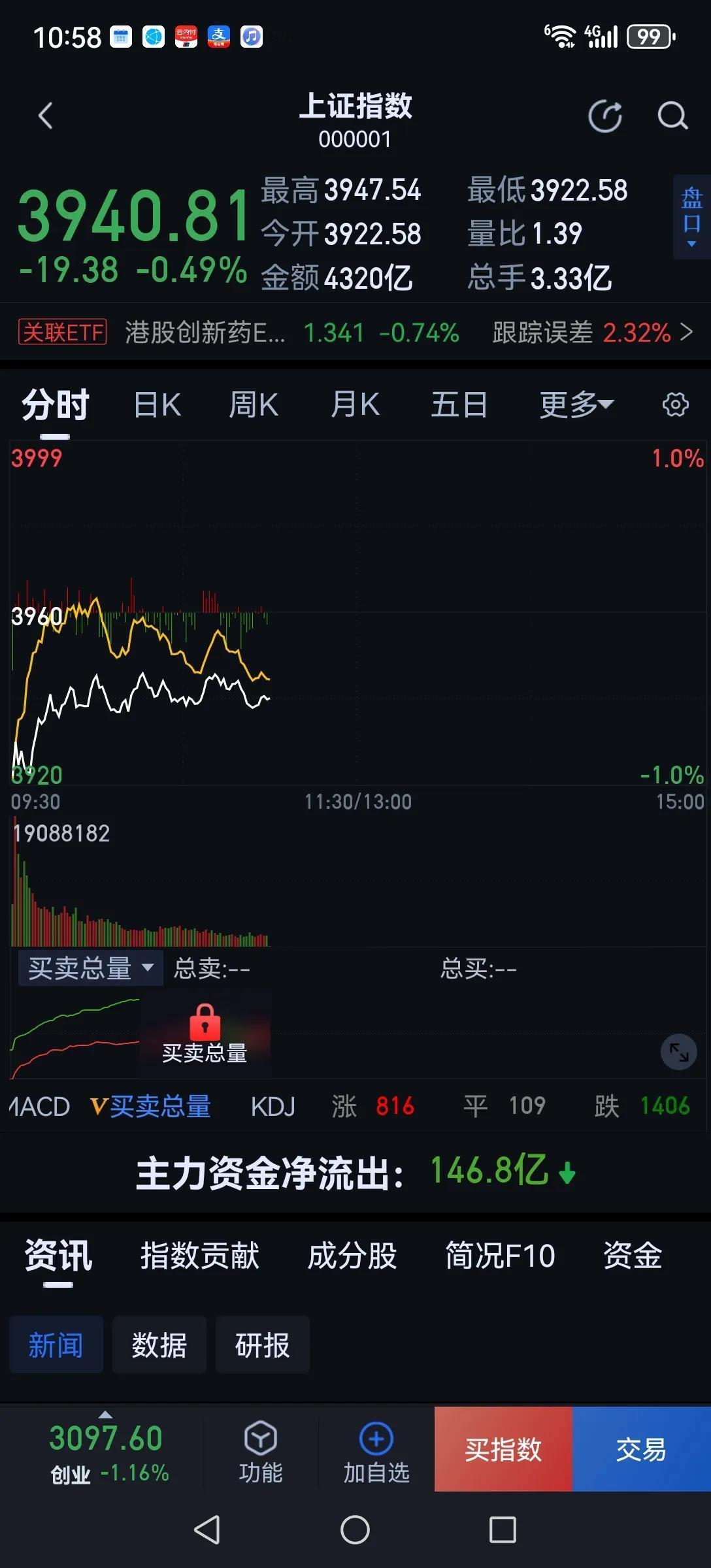 上攻无力,谨防调整。今天上午又上演拉银行护指数跌个股的行情,亏钱效应明显。上攻无