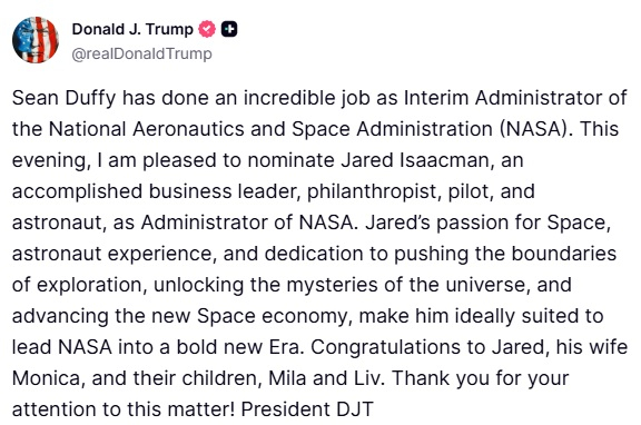 马姆达尼果然赢下了纽约市长,截止目前阿川还没发帖。但阿川趁机宣布了一项有点惊人的决定,任命马斯克的好友航天富豪——艾萨克曼担任NASA局长,交通部长肖恩不再兼任NASA代理局长。马斯克前一阵一直追着代理局长肖恩狂骂,说他智商低不配当NASA局长,看来这么骂真管用啊。