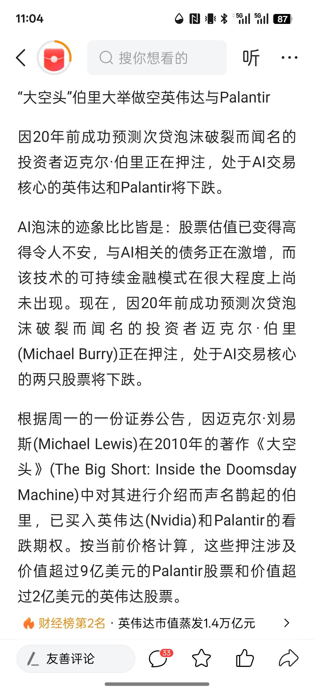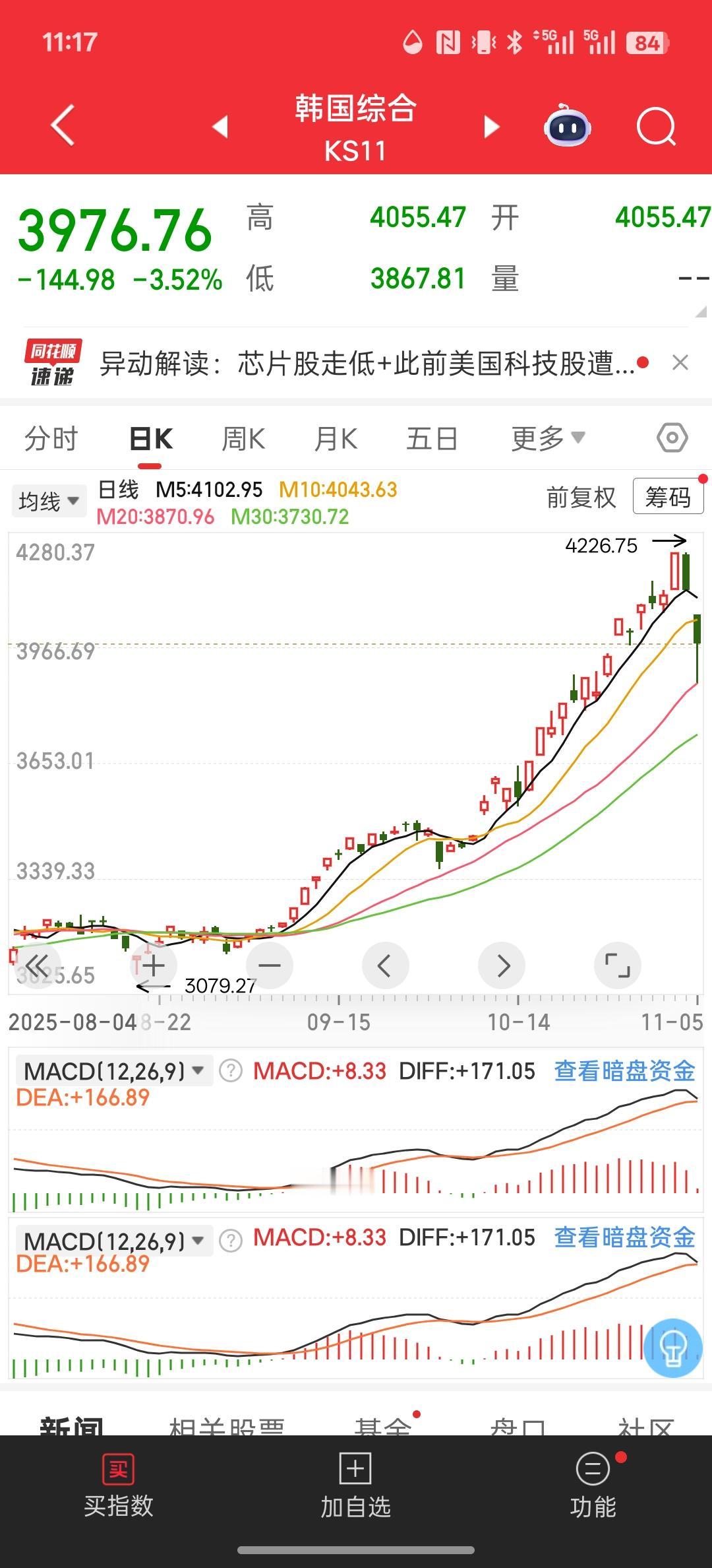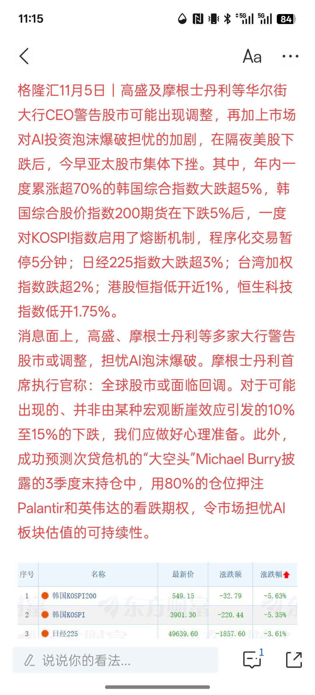 韩股跌超5%触发熔断,日股跌超3%,A股早盘低开,今天A股必然会反弹,向上收红盘,忧AI泡沫!亚太股市集体下挫,韩股跌超5%触发熔断,日股跌超3%。目前预测,次贷危机的大空头看空美股,而且看空美股高科技上市公司,包括英伟达,网传特朗普的儿子也跟着买跌美股的期权!这次买了1000多万美元看跌期权! 今天整个亚太股市都出现了大跌,但是A股早盘一个低开,今天必然会反弹向上。在高盛的研报当中,已经说全球会有一个调整,但依然看好中国股市,中国股市依然是全球资本的配置青睐的地方,所以今天A股应该会反弹向上! 整体来看,中国股市依然非常强劲!