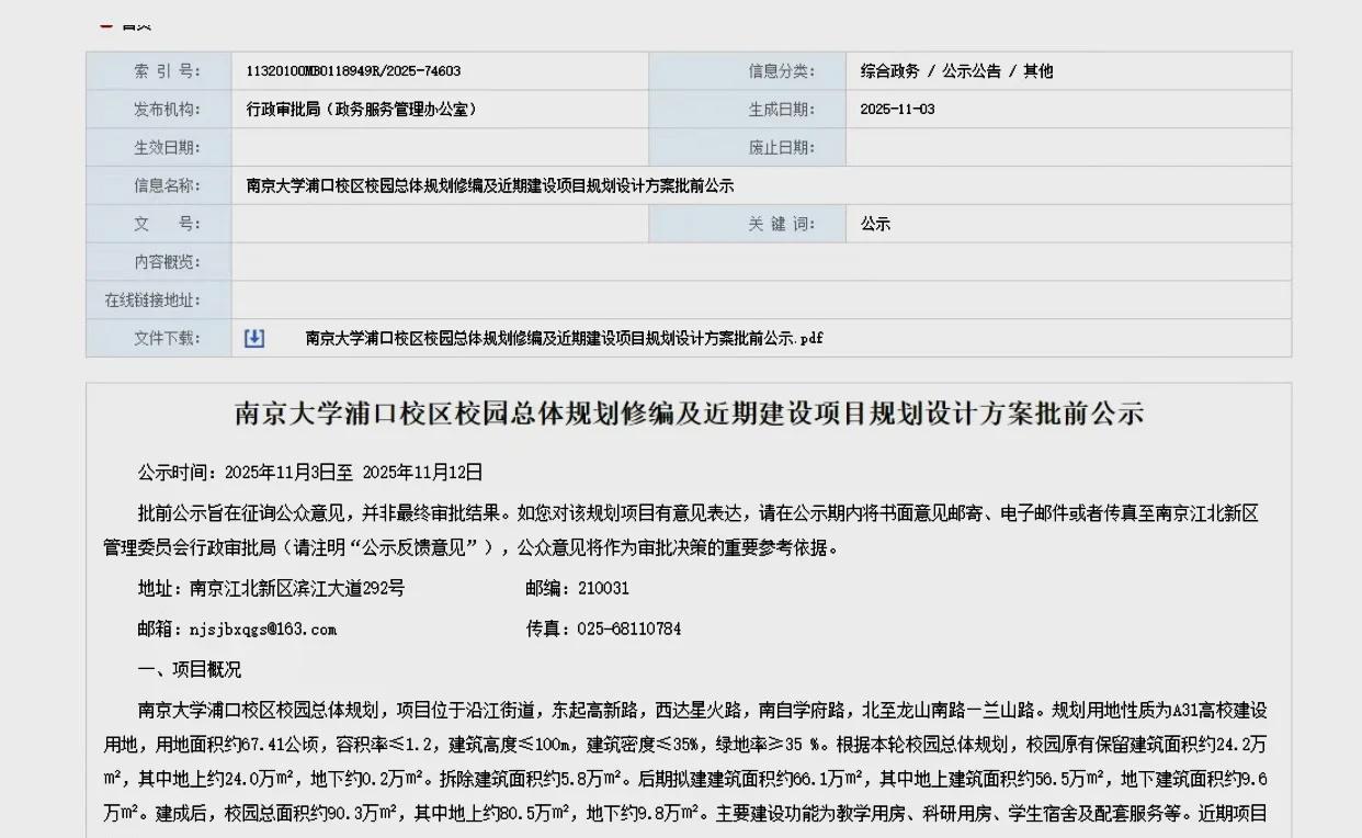 🔥这所985大学,“重仓”江北 今年8月,江北新区 与 南京大学 签署战略合作协议共建南京大学浦口校区(江北校区)。 校区体量扩容3.7倍,两栋科研楼即将启动建设,南大浦口校区扩容!南京大学浦口校区校园总体规划修编及近期建设项目规划设计方案批前公示。 南京大学浦口校区位于江北新区高新板块,东起高新路,西达星火路,南自学府路,北至龙山南路一兰山路。 整个学校用地面积约67.41公顷,也就是大约1011亩,从卫星地图上来看还是比较大的。 值得注意的是,作为曾经南京大学金陵学院所在地,学校内是有不少基础教学建筑存在的。文件显示,校园原有保留建筑面积约24.2万方,拆除建筑面积约5.8万方,后期拟建建筑面积约66.1万方。 校园总面积约90.3万方,是原来建筑面积的3.7倍,学校建筑面积得到了极大的扩容,未来也能够容纳更多的师生,以及教学设备。 江北发展南京大学浦口校区 城市规划 南京高端楼盘