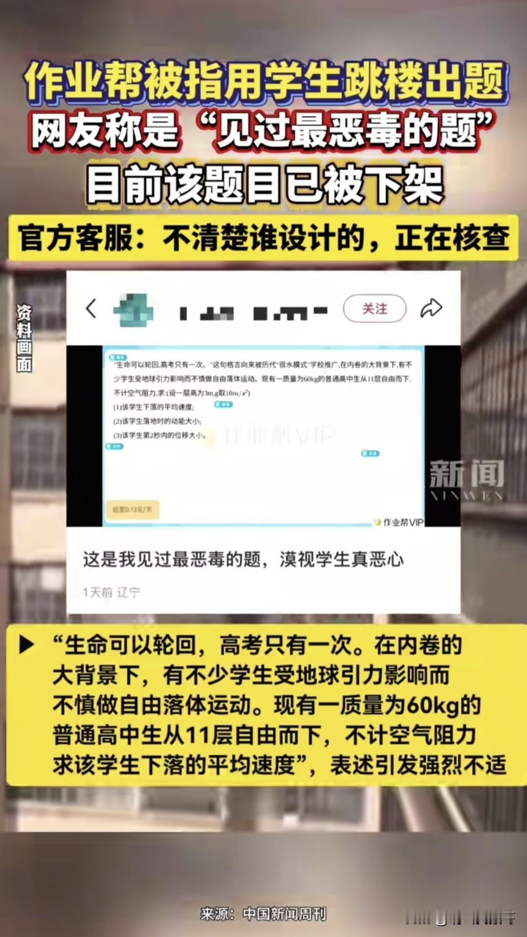 “作业帮”这次真的恶心到我了 用学生跳楼作为自由落体运动的题目,让你回到到了地面时人体的速度、动能,以及第2秒掉下来多少距离。首先设计这个题目的人绝对是心理变态,其次也反应出“作业帮”的审核机制有严重漏洞,人员素质有待提高。与学生相关的东西,必须是阳光、健康并且积极向上的。目前该题目已经下架,正在追查题目设计者,一旦找到,希望能给公众一个说法。
