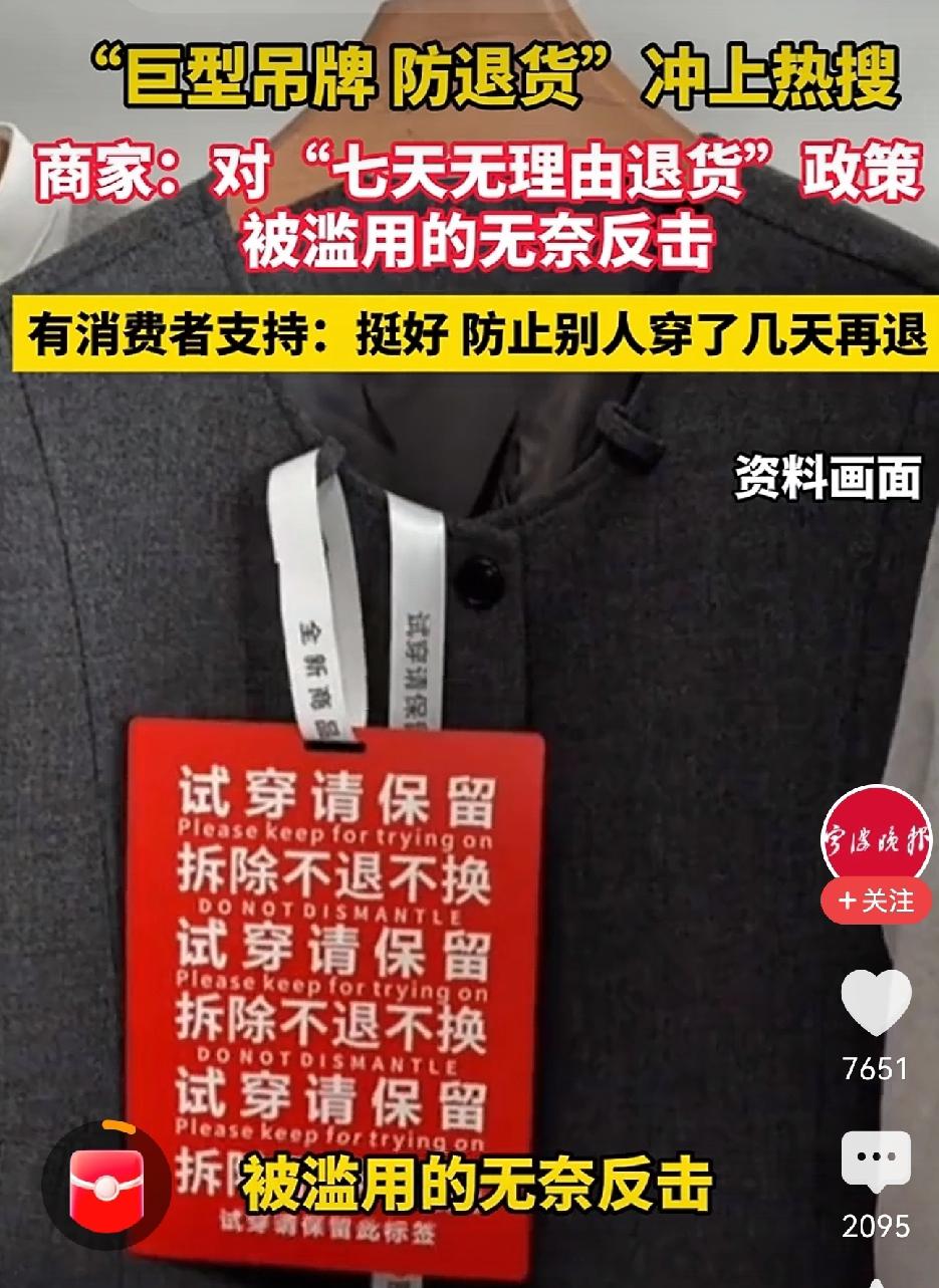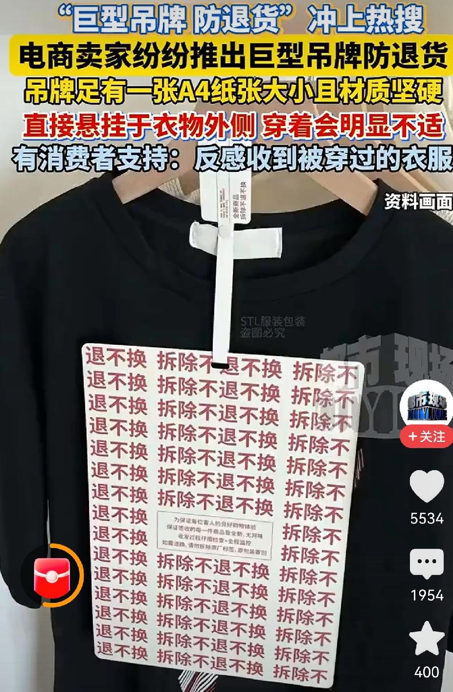 实在是被逼无奈啊! 最近,衣服上的巨型吊牌登上了热搜。 商家为防止那些爱薅羊毛的小仙女恶意退换货,直接制作巨型吊牌挂在衣服最显眼处。 商家这无奈之举,惹得小仙女们不满,她们纷纷表示要把商家拉入黑名单,以后再看到商家这么做,买完衣服就立刻退掉。 这恶意可真是满满当当啊! 我支持商家的做法,要是衣服不合适,马上退款便是。这和商标挂在哪里有什么关系呢! 吊牌退货 包装吊牌 吊牌女装 服装吊牌包装