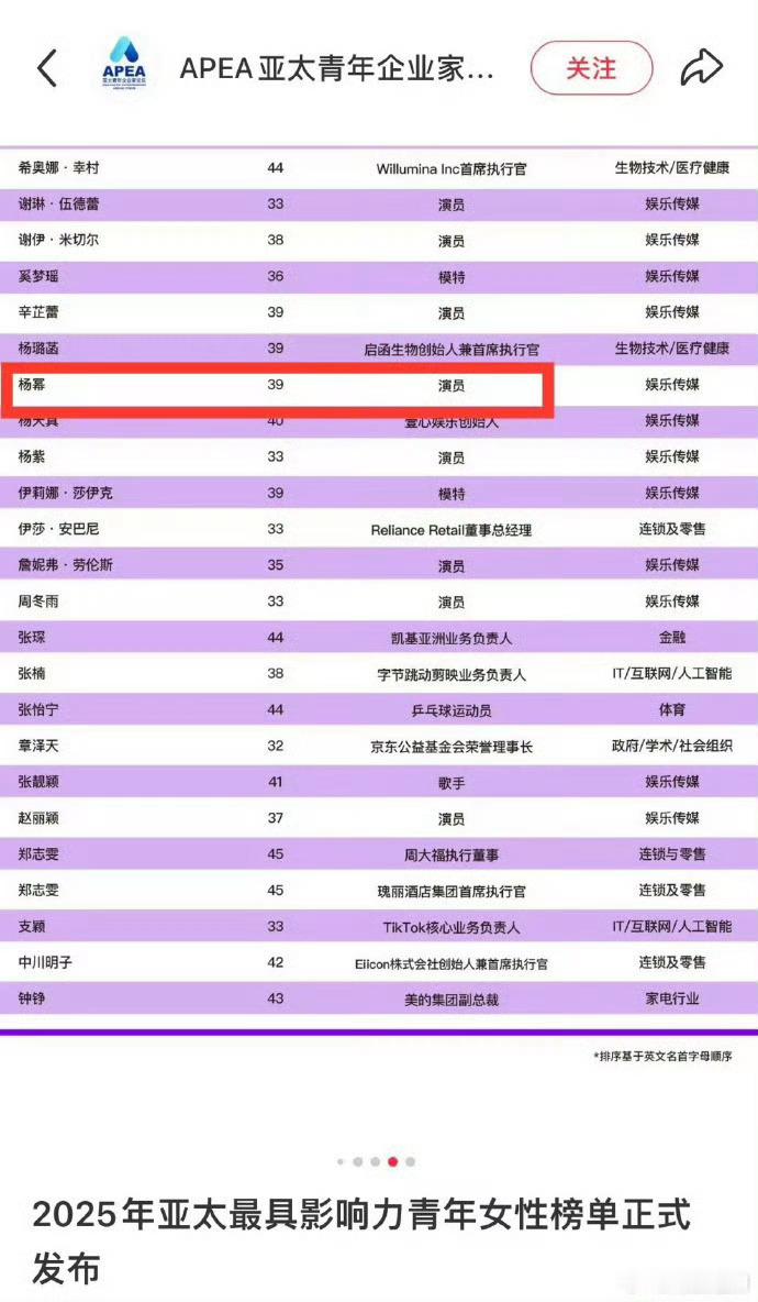 杨幂入选2025亚太最具影响力青年女性榜单,我只能说幂神罢了!