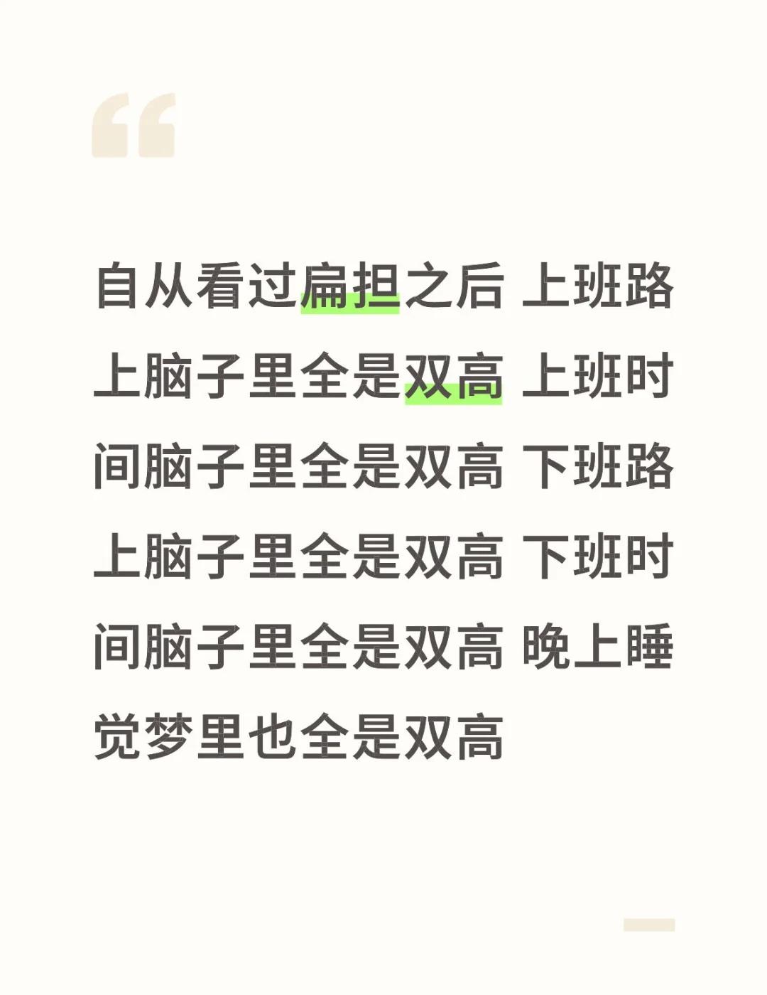 自从看过扁担之后 上班路上脑子里全是双高 上班时间脑子里全是双高 下班路上脑子里全是双高 下班时间脑子里全是双高 晚上睡觉梦里也全是双高