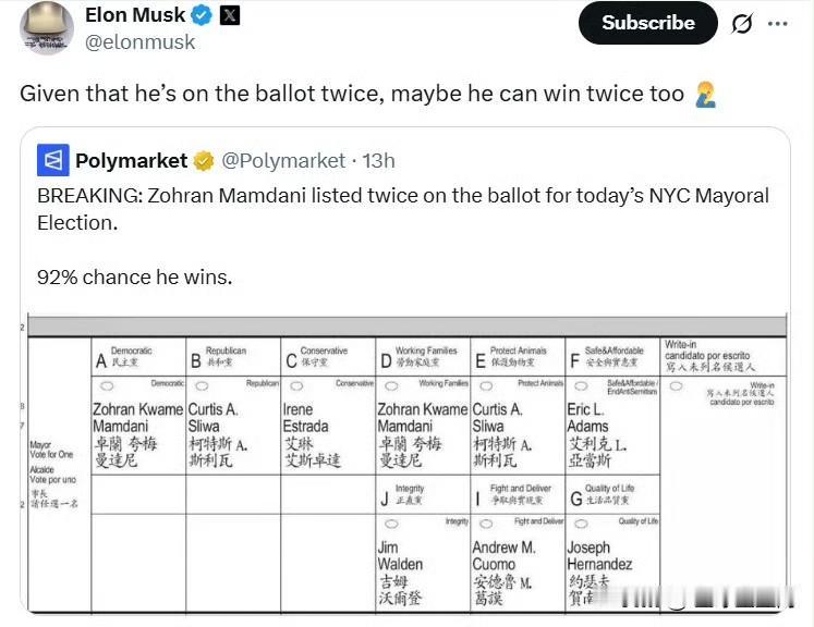 Polymarket:佐兰·曼达尼在今天的纽约市市长选举选票上出现两次,92%的胜算。 马斯克:鉴于他在选票上出现两次,说不定他还能赢两次呢。