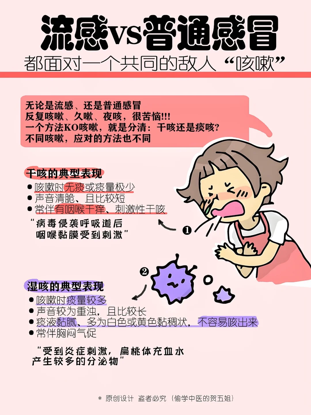⭕但不管是流感还是感冒,退烧后都逃不过“共同敌人”——咳嗽‼想要KO咳嗽的关键,是先分清“干咳”还是“湿咳”!