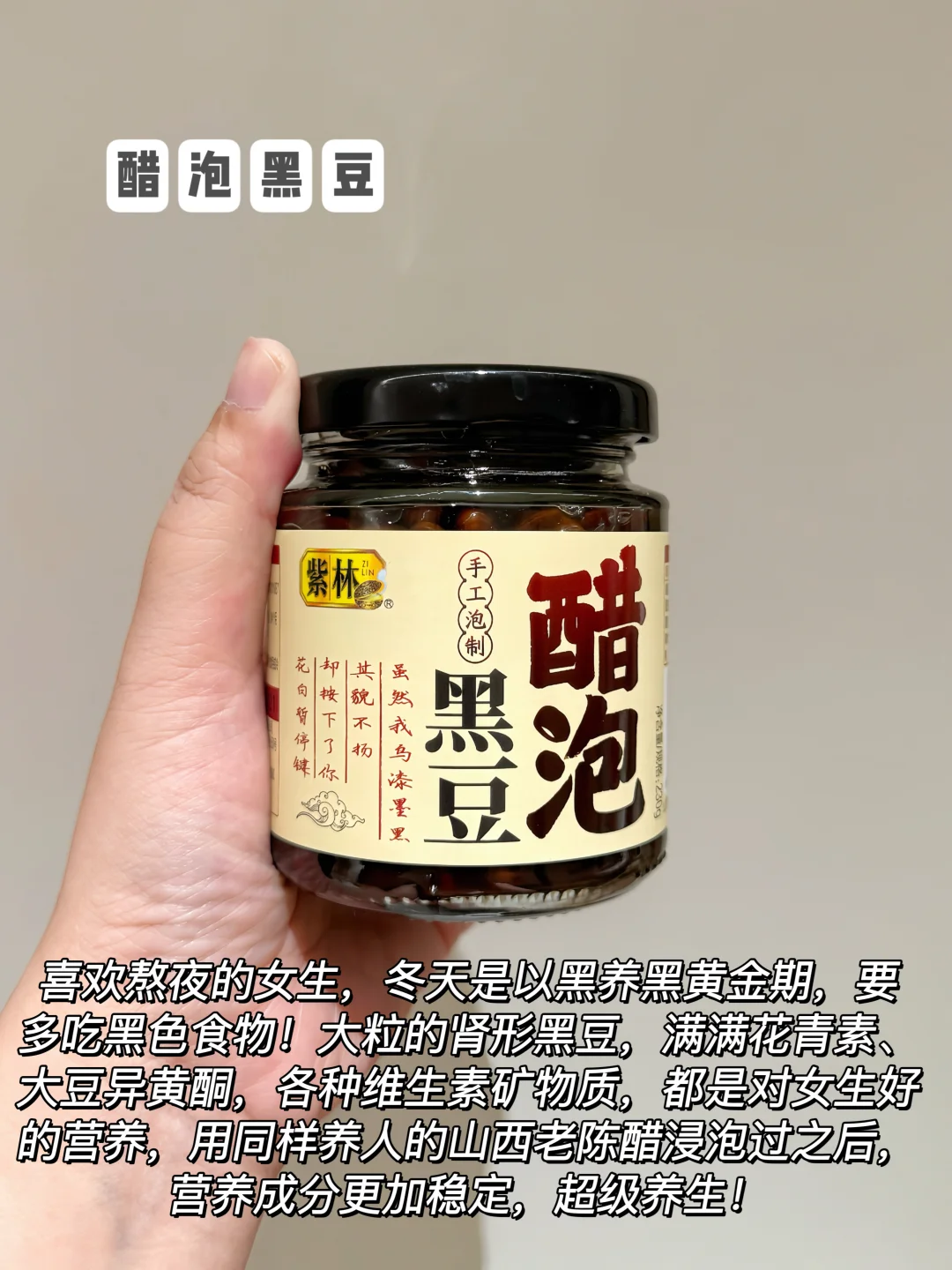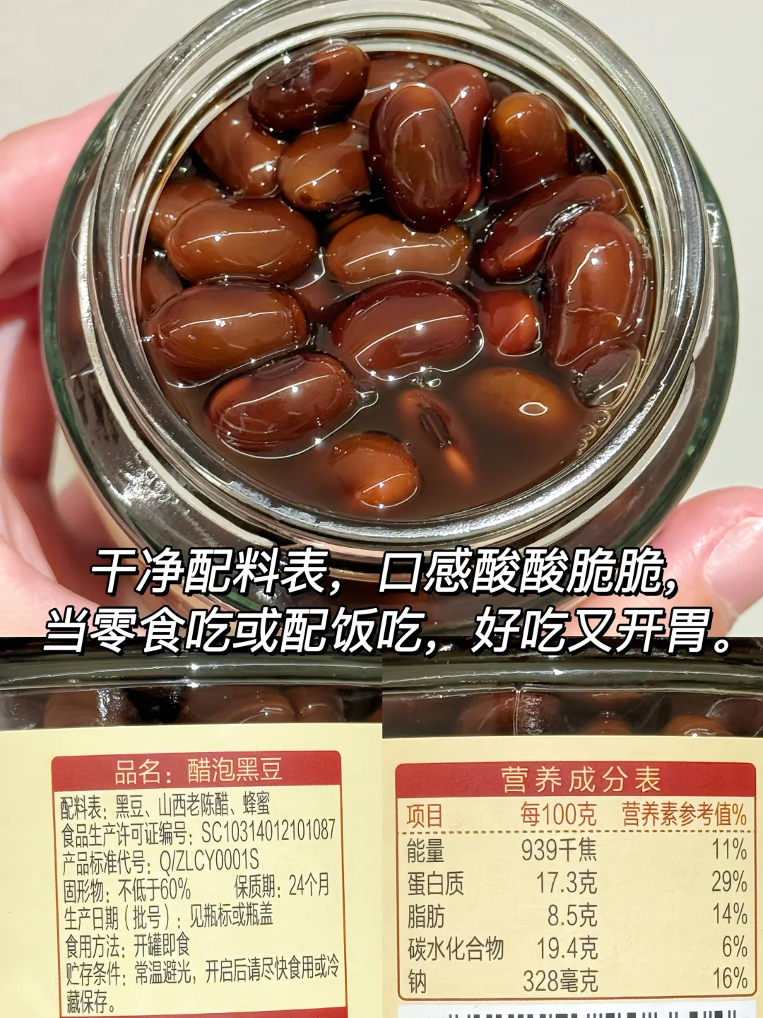 秋冬养生什么都可以不吃,但醋泡黑豆一定要试试,尤其是喜欢熬夜的女生。四季食养,冬天是以黑养黑的黄金期,要多吃黑色的食物,尤其是大大粒的肾形黑豆,满满的花青素、大豆异黄酮,各种维生素矿物质,都是对女生好的营养成分,用同样养人的山西老陈醋浸泡过之后,里面的营养成分更加稳定。干净配料表,口感酸酸脆脆,当零食吃,或者配饭吃,好吃又开胃。