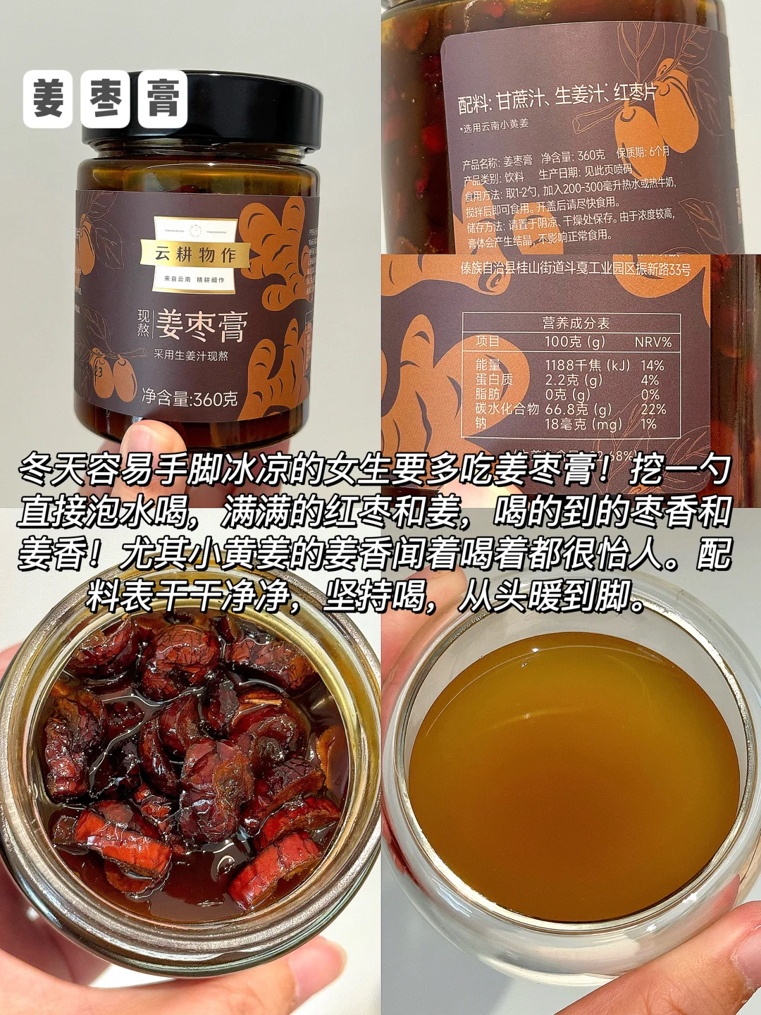 冬天容易手脚冰凉的女生要多吃姜枣膏!挖一勺直接泡水喝,满满的红枣和姜,喝的到的枣香和姜香!尤其小黄姜的姜香闻着喝着都很怡人。配料表干干净净,坚持喝,从头暖到脚。