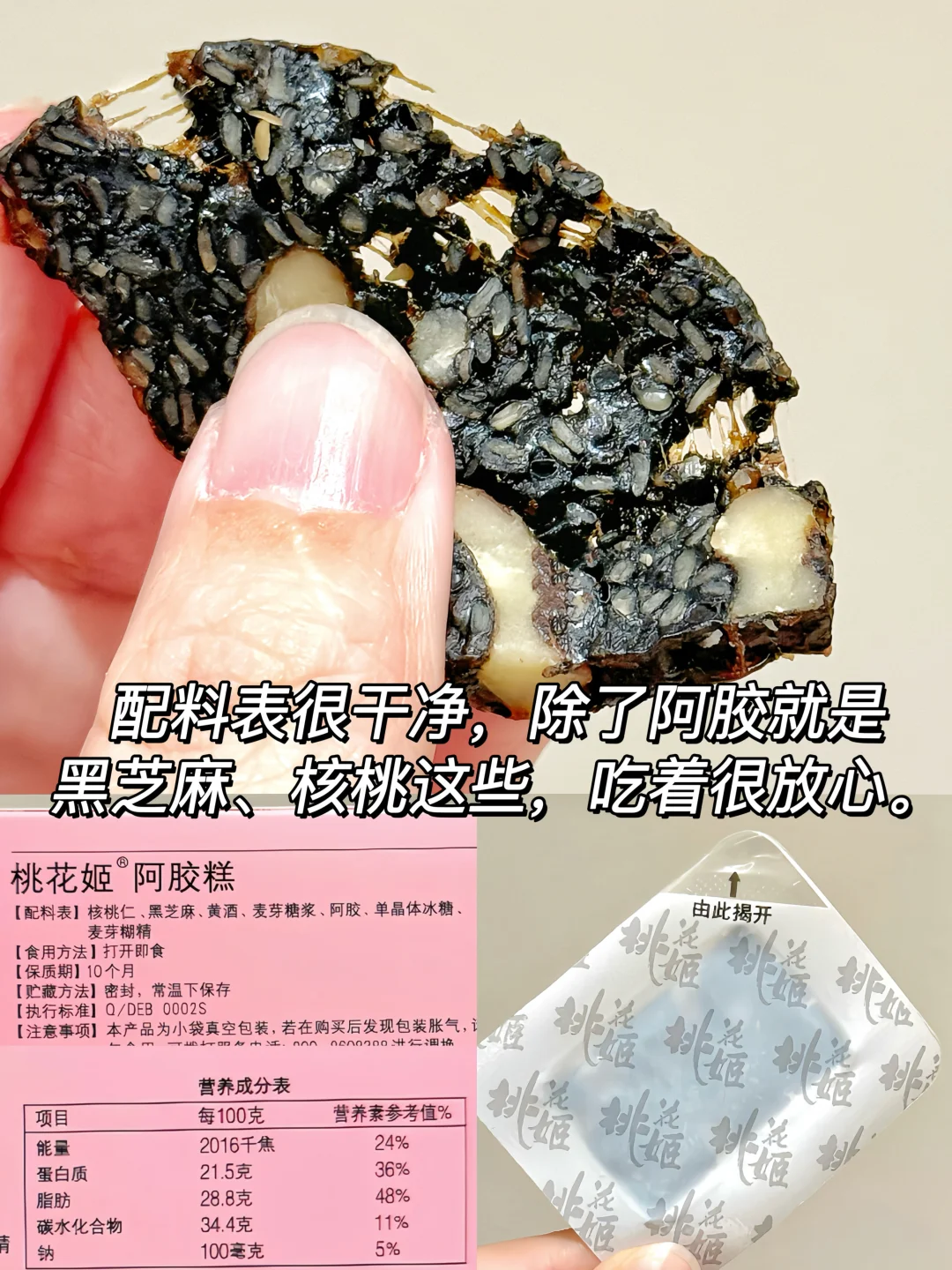 阿胶糕的好女生都知道,我身边保养好的妈妈辈基本都在吃,而且是从年轻就开始的好习惯。吃阿胶糕主要还是为了吃阿胶,一定要选正宗的阿胶,从味道到营养价值都能吃的出的好!我现在跟着我妈妈坚持在打卡!配料表很干净,除了阿胶就是黑芝麻、核桃这些,吃着很放心。