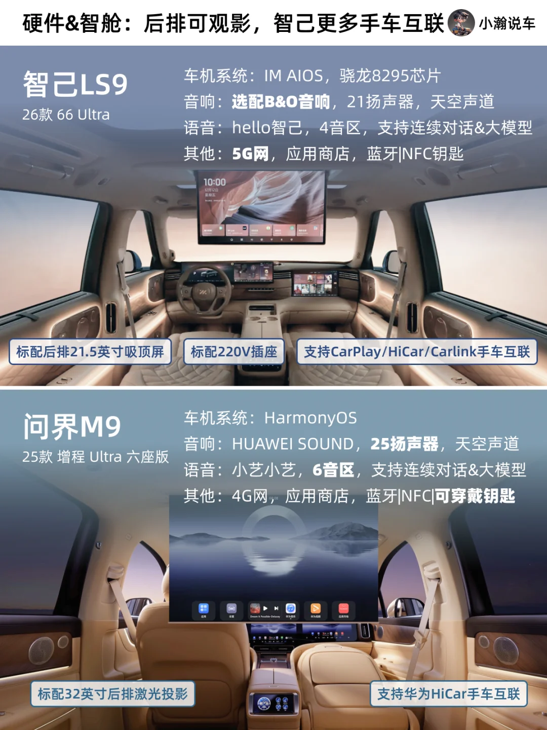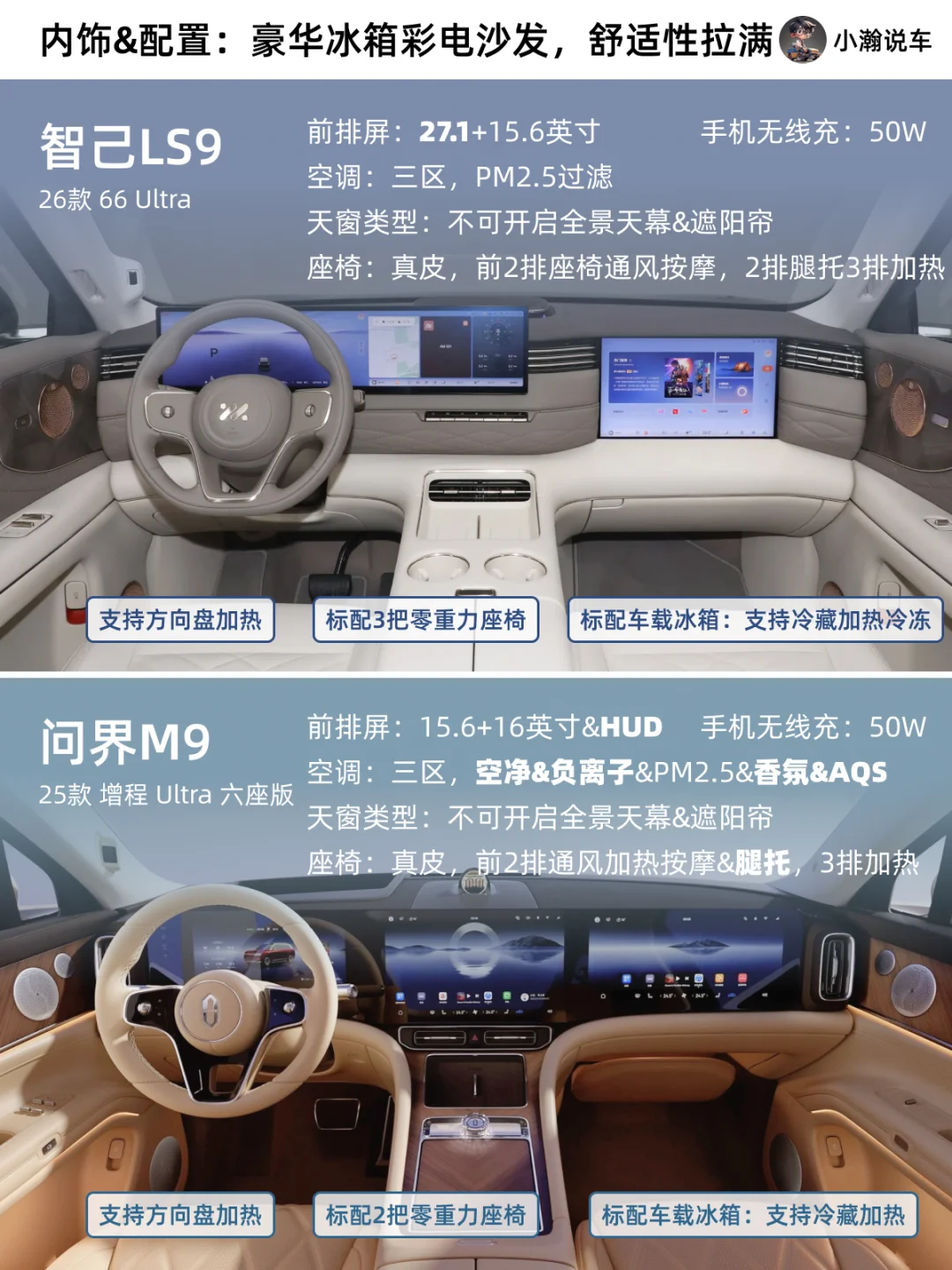 总的来说:超6米的车长、豪华6座布局、满血智能配置,每一项都戳中了高端家庭和商务用户的需求。集这个时代的开拓能力、开阔视野和豪华体验于一身,通过功能性配置,四轮转向、防爆系统、双腔空悬等配置加持,再加上智己公认的优秀底盘调校,这样一台豪华大六座SUV如果拿来PK问界M9,你会选择这款智己LS9吗?