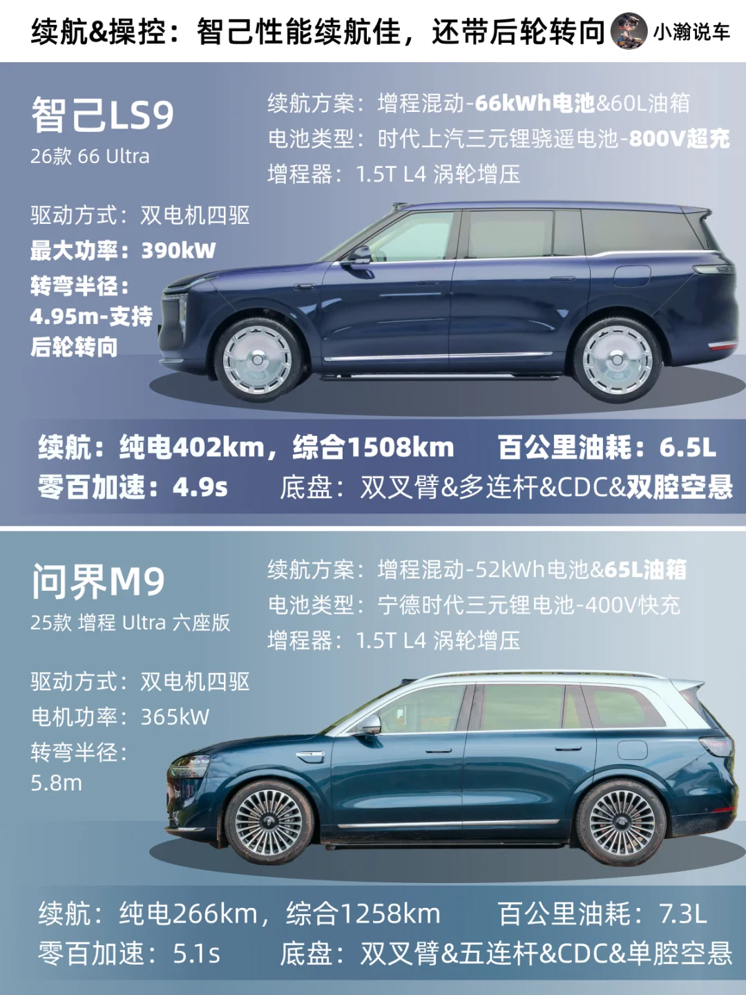 🌟续航操控上:智己LS9搭载LS6同款的恒星超级增程系统,匹配66kWh宁德时代超级骁遥Max电池,CLTC纯电续航就有402km,综合续航更是超1500km。还搭载了支持双向24°四轮转向的灵蜥数字底盘3.0,配备150mm超大行程闭式双腔空悬,过急弯易操控、侧倾小。