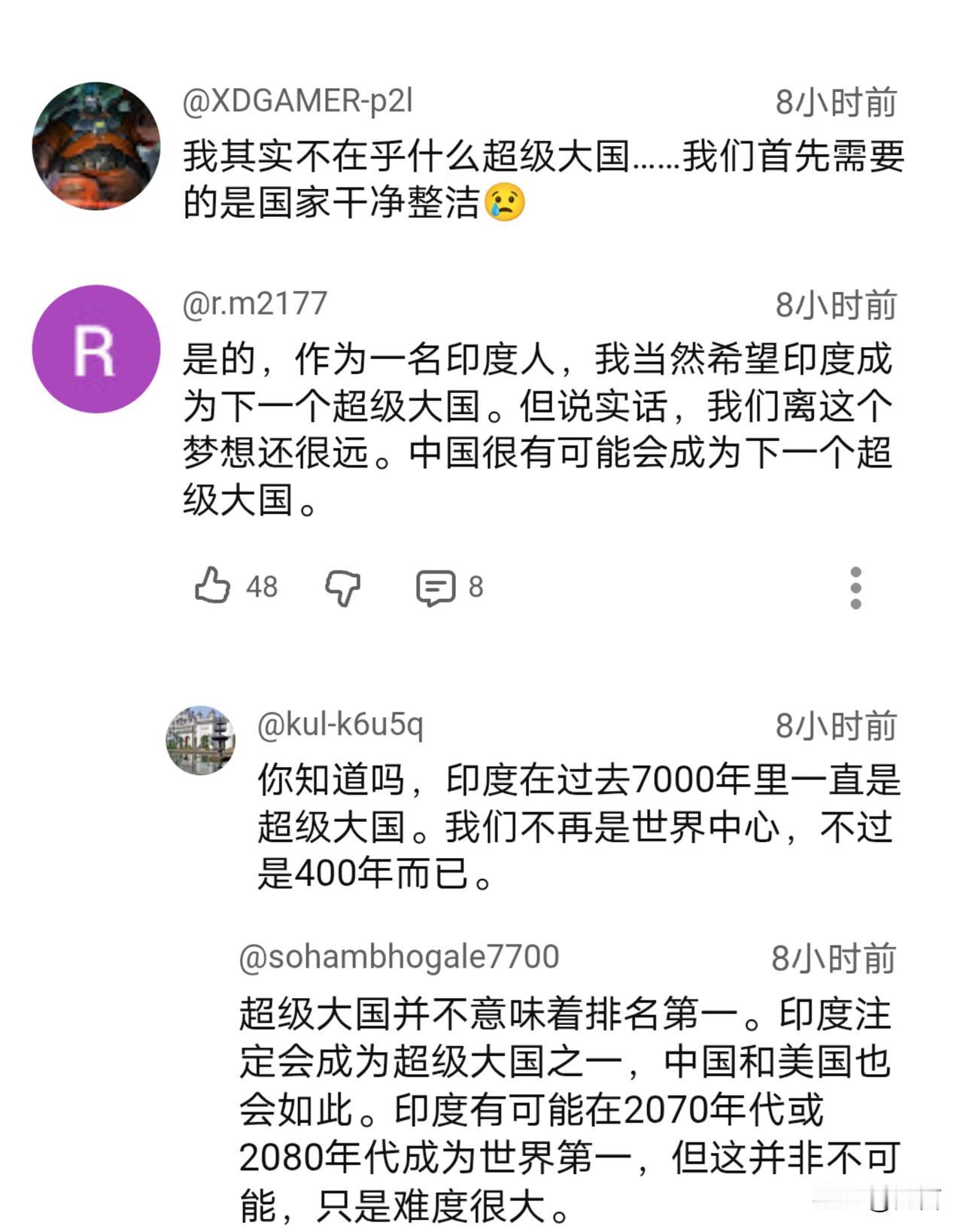 下一个超级大国?此刻,就连印度网友都不相信。 据一位印博主11月4日透露,以色列非常看好印度的发展潜力,称其会成为下一个超级大国。 闻讯后的印网友不淡定了,与以往不同时是,有不少人认为,想要成为超级大国并不容易,发展契机、创新能力等缺一不可;还有的则是更关心解决当前短板。 就规模和发展潜力而言,印度已经具备成为超级大国的条件,只要短板得到齐和把握住发展机遇,或可以得偿所愿…
