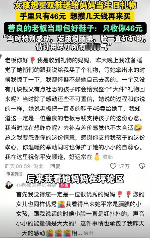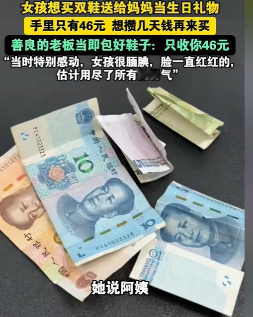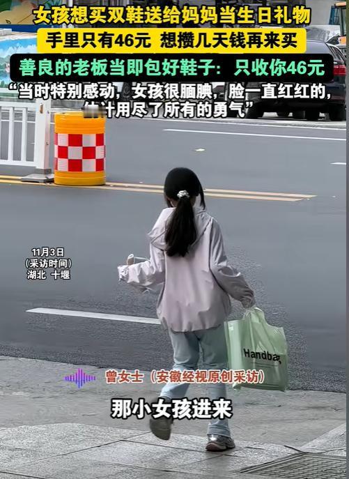 近日,湖北一十几岁的小女孩怯生生的走进了一家鞋店内,女孩拿起一双鞋试了几次后,竟没买,红着脸对店主说:“能不能把鞋子留下过几天来买?”面对女孩的请求,店主一脸诧异,随后便问了女孩,得知原由后,随后做出的一个温暖决定,让无数网友为之动容。 “阿姨,能等我攒够钱吗?” 那天,女孩的身影出现在店门口,她犹豫了一会儿,才怯生生地走进来。她看了好半天,才拿起一双鞋子,仔细地看了看,又放下,过了一会儿,又再次拿起,这个重复的动作,引起了店主曾女士的注意。 当女孩把鞋子穿在脚上时,曾女士听见她小声地嘟囔了一句:“码数应该合适……” 让曾女士没想到的是,女孩没有询问价格,也没有讨价还价,而是红着脸对她说:“阿姨,能把这双鞋留着,我过几天再来买吗?” 在商言商,曾女士对此自然一脸诧异。但她没有简单地拒绝,而是温和地问:“为什么呢?是钱没带够吗?” “我……我想给我妈妈买双新鞋,作为生日礼物,”她顿了顿,又鼓起勇气继续说:“但我今天只带了46块钱,不知道够不够。如果不够,我回去再攒攒,您能帮我留着吗?” 这个数字在当下的消费环境里,可能是一杯咖啡的价格,一份外卖的费用,在这里却是一个孩子为母亲准备一份心意的全部预算。 曾女士看着眼前这个衣着朴素却眼神清澈的女孩,还有她手里那一沓皱巴巴的零钱,就知道,那应该是女孩攒了很久才凑齐的,当下心一软,就笑着说:“46元啊?正好,这双鞋今天做活动,原价100多,现在就卖46元。”说完就立马找袋子把鞋子包了起来。 看着女孩一蹦一跳地离开,曾女士虽然亏了钱,心里却无比温暖。 后来,曾女士把这件事发到了网上,女孩的妈妈看到了,就给曾女士评论说,女孩是个很腼腆的孩子,这次能这么勇敢,她也没想到,非常感谢曾女士保护了孩子的自尊心。 其实,这样的温暖每天都会悄悄发生,就像菜市场阿姨多塞给顾客的一把葱,快递小哥顺手帮老人拎重物上楼,街边的店老板给遇到困难的人送的一份热饭。这些细碎的善意,平时不显山露水,却最能温暖人。 就像曾女士说的:“亏了本钱,却赚到了一份感动,值了。”因为真正动人的,从来不是礼物的价格,而是背后那颗无价的心。 信源: AHTV第一时间——女孩想买双鞋送给妈妈当生日礼物,可手里只有46元,老板当即把原价159元的鞋包好:只收你46元。老板:当时特别感动,女孩很腼腆,脸一直红红的,估计用尽了所有的勇气。 文|一阳 编辑|史叔