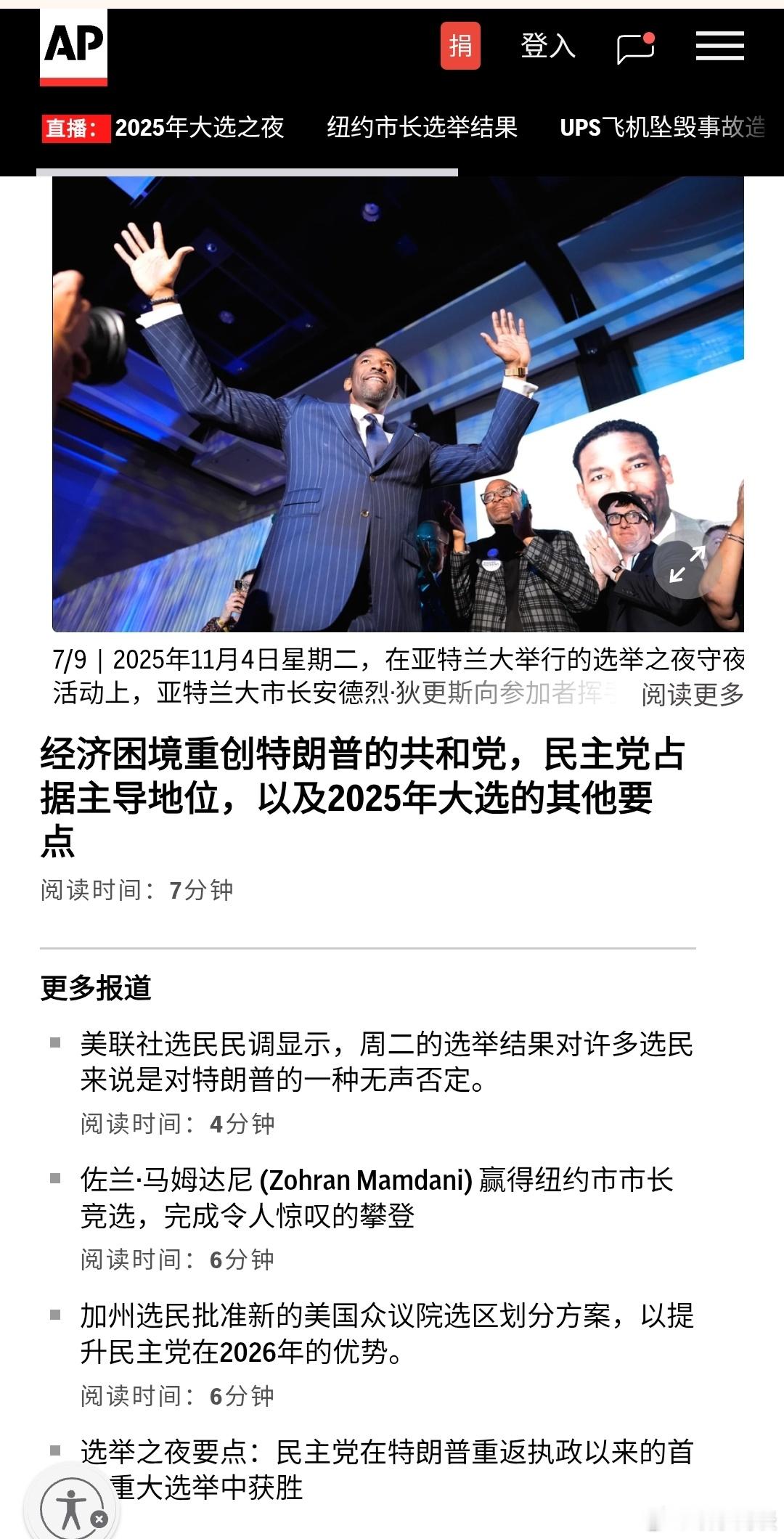 在布鲁克林举行的庆祝派对上,美联社宣布马姆达尼胜选后,他的支持者们欢呼雀跃,互相拥抱,有些人甚至热泪盈眶。竞选海报在空中飞舞,有人升起了纽约市的官方旗帜,音响里播放着坏兔子(Bad Bunny)的歌曲。