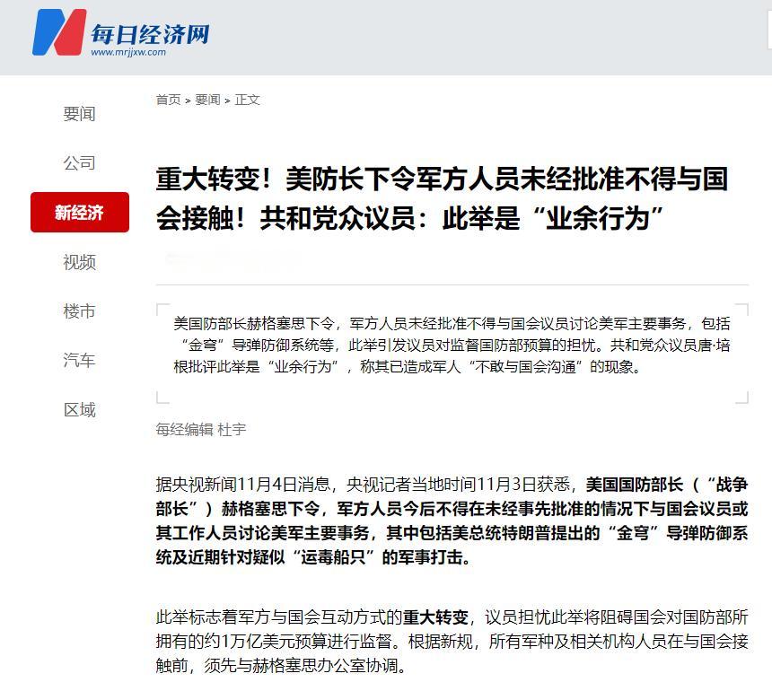 美国国防部长突然宣布   11月4日,美国国防部长赫格塞思下了道狠命令:军方人员跟国会议员聊美军正事,必须先拿审批,不然免谈。像特朗普力推的“金穹”导弹防御系统、最近在海上打“运毒船”这些事,都被框在了受限名单里。   这道命令就跟块铁板似的,把以前还算顺畅的沟通路堵得严丝合缝。要知道以前美军和国会打交道,虽说有规矩,但没这么死板。比如议员想问“金穹”系统的预算花哪儿去了,或者质疑海上打击行动合不合法,打个电话、开场听证会,就能直接跟军方负责人对上话。   现在倒好,所有话都得先汇总到赫格塞思的办公室,先筛一遍、再批一遍才能传出去,等于给美军的嘴装上了个“过滤器”。   特有意思的是,命令下达当天,美军刚好在东太平洋的国际水域搞了场打击“运毒船”的行动,直接弄出了2条人命。赫格塞思自己还在社交账号上晒功劳,说“情报确认这船就是贩毒的,击沉它没毛病”。   可偏偏就是这桩热乎事儿,成了命令里的“敏感话题”,议员想追问行动的细节、问问人是怎么死的,都得先写申请等着批。要知道这事儿已经引来了委内瑞拉、古巴这些国家的骂声,联合国都发声明关注了,国会本来想赶紧问问情况,结果被这道命令卡得没脾气。   赫格塞思敢下这么狠的命令,说白了是有“前车之鉴”的。半年前的“群聊泄密”事件还没过去呢,这位防长把也门空袭计划、武器部署这些顶级机密,直接发到了商业聊天软件的群里,结果不小心把《大西洋月刊》的主编拉了进去,差点闹出外交大乱子。   那时候国会就骂他“太鲁莽”,现在搞这套审批制度,表面上是堵泄密的窟窿,实际上更像是把军方的话语权攥在自己手里。   这位防长本来就不按常理出牌。当国防部长之前,他是福克斯新闻的主持人,靠着跟特朗普的私人关系才坐上这个位置。他既没在五角大楼干过,在阿富汗当兵的时候也只是个教官。更有争议的是,他还出过扔斧头砸伤人、被人告性侵这些事儿,最后都是花钱摆平的。   就这么个人,上任后差点把“国防部”改成“战争部”,现在又拿国会当靶子,也难怪众议院领袖直接骂他“有他在,美国更危险”。   被锁住的不只是聊天的嘴,还有美军办事的效率。“金穹”系统本身就争议不断,特朗普一直催着砸钱扩建,但国会总怀疑这东西到底能不能拦住导弹,原本计划这个月开的预算听证会,现在因为要走审批流程,说不定得推迟。   而海上打击行动更麻烦,从9月到现在,美军已经沉了十多艘所谓的“运毒船”,打死六十多个人,国会早就想查这事儿是不是违反国际法了,现在连军方的人都调不动问话。   美军内部更是怨声载道。有基层军官私下吐槽,以前能直接跟议员反映装备老化的问题,现在申请递上去三天没回音,士兵训练的安全都受影响。议员们也觉得自己被架空了,有共和党议员直说“这哪儿是防泄密,分明是防我们监督”。要知道美国本来就是国会盯着军方干活,互相牵制的规矩,现在国会被一道命令掐住了喉咙,矛盾只会越积越深。   说到底,赫格塞思这把“锁”,根本锁不住真风险,反而可能把内部矛盾越激越烈。一边是他自己搞出来的泄密烂摊子还没收拾完,一边又用这种极端法子管控信息,这种“头痛医脚”的做法,只会让五角大楼和国会的裂缝越来越大。至于被连累的“金穹”系统和海上行动,恐怕还得在这种内耗里,多等些日子才能有下文。