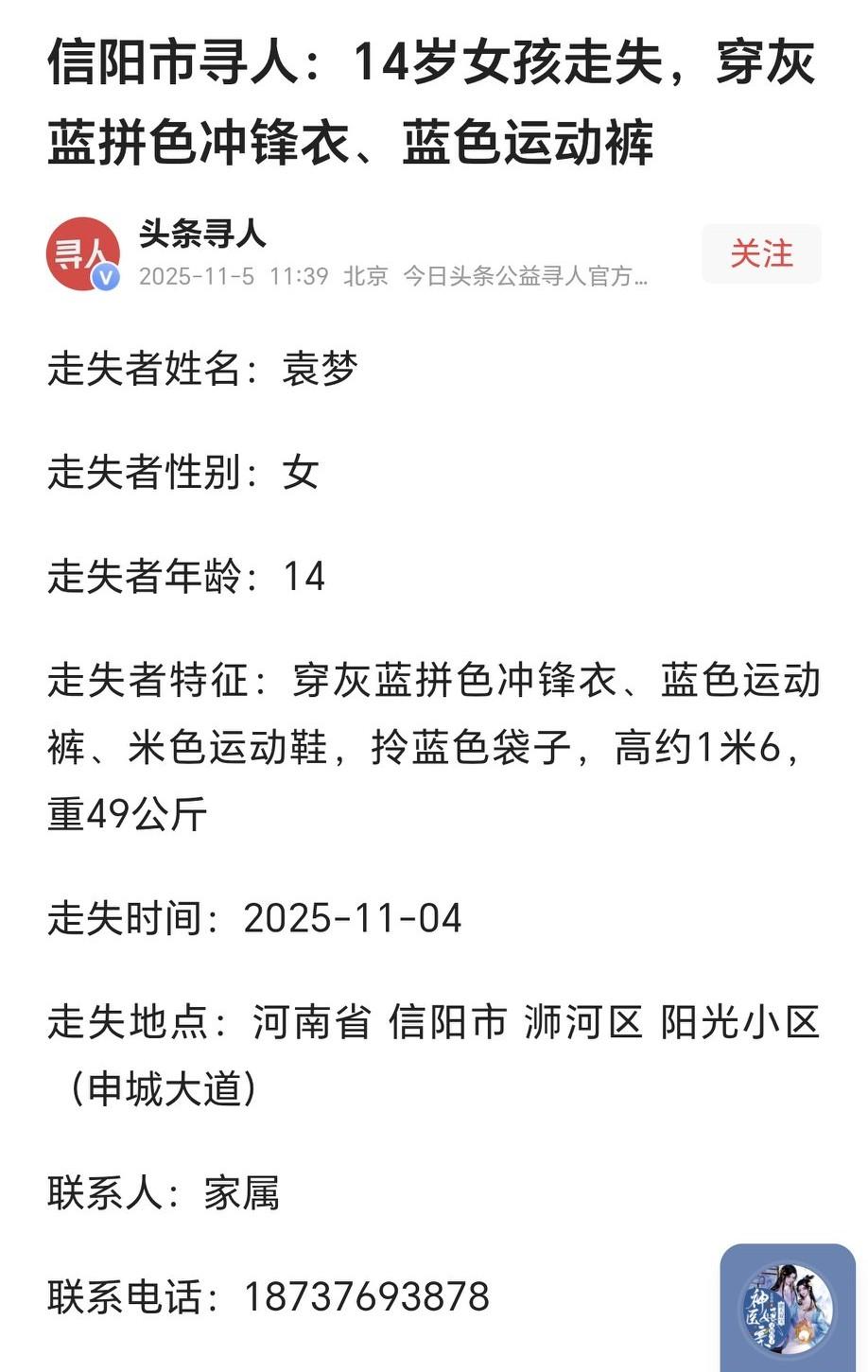 14岁女孩袁梦,家住信阳市浉河区阳光小区,2025年11月4日走失了。她身穿灰蓝拼色冲锋衣、蓝色运动裤,脚蹬米色运动鞋,还拎着个蓝色袋子,身高约1米6,体重49公斤。家属心急如焚,且已经报警,联系电话是18737693878,信息由信阳市公安浉河分局民权派出所提供。 孩子也不小了,这次走失是有意还是无意暂时还不好说,有些孩子离家出走,是故意躲着家人。青春期孩子逆反心理重、心思敏感。家长教育孩子得多倾听、少指责,用理解代替批评,不然孩子一不开心就玩失踪,操心的还是父母家人。 希望袁梦能平安回家,大家要是有线索,一定要及时联系家属或者公安。