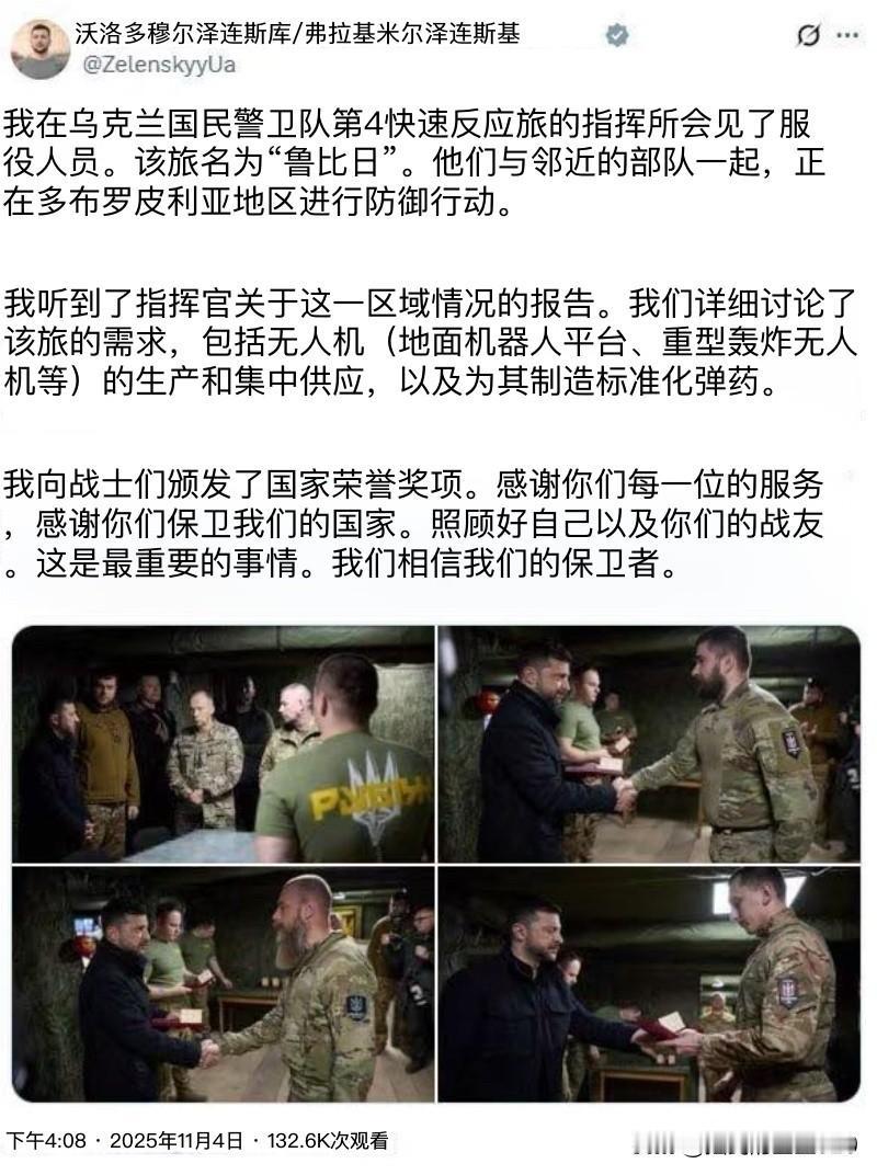 马赛克都懒得打,装都不装了,乌克兰总统泽连斯基在当地时间11月4日发文,表示慰问了乌克兰国民警卫队第4快速反应旅的指挥所,该旅名为“鲁比日”。 泽连斯基在访问期间,会见并慰问了在该旅服役的官兵,并进行了授勋仪式,向官兵们颁发了荣誉勋章。 值得注意的是,泽连斯基发布的相关现场照片中不乏可以看到一些被国际社会禁止的NC符号,可以说完全不加以遮挡,甚至是故意向外界展示并宣传该符号的合规合法性。 有网友表示:演都不演,装都不装,直接摊牌了。 还有网友表示:NC乌克兰,实锤了,也早就被实锤了,没什么大惊小怪的。世人早已皆知。