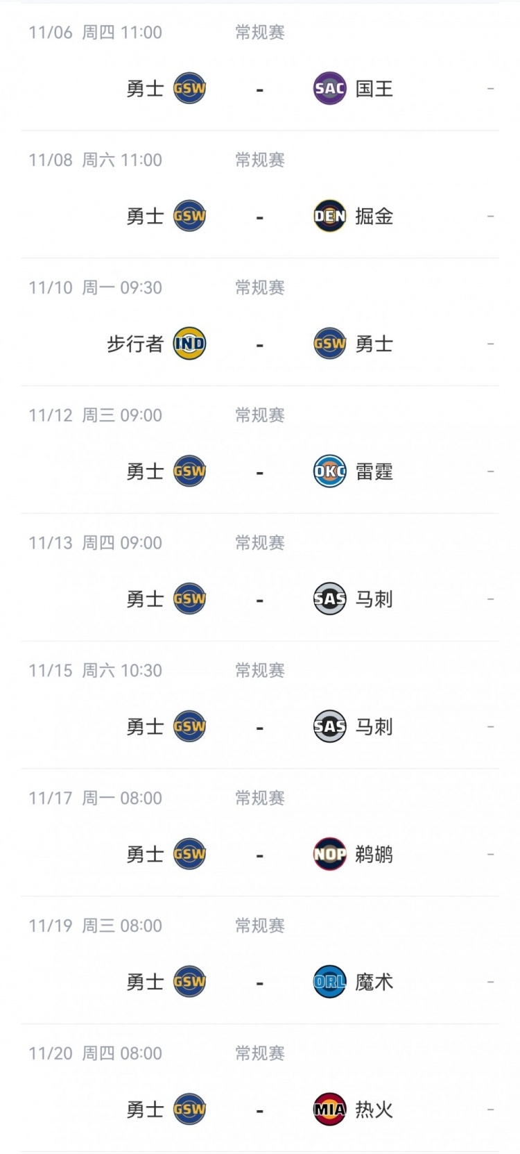 上个月六场比赛,连续两个四天三赛,这个月除了两个背靠背,接下来半个月时间,勇士9场比赛里有8个客场。