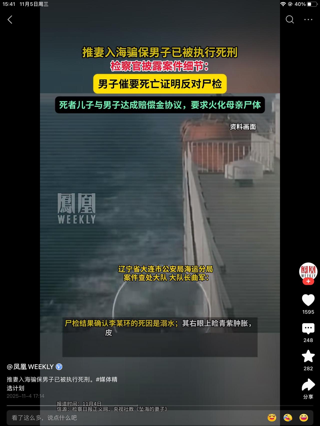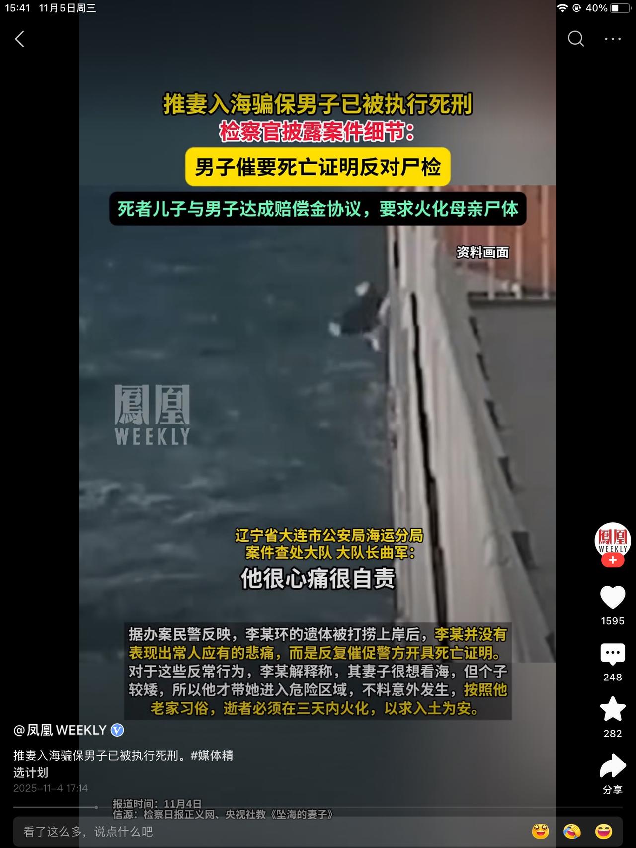 推妻入海的男人已经被执行死刑了。好歹她曾经是他的女人,他怎么能这么狠呢? 一个女人带着儿子嫁给了一个男人,男的破产没钱,给女人入了高额保险。以后狠心把她推下海。死了。 结果呢,女人的亲儿子竟然跟男子达成赔偿金协议,要求尽快火化母亲的遗体。这个故事,看的人是毛骨悚然。 事后男子在酒店招嫖,被发现,继而被调查,才发现原委。这世界,不全是好人,女人啊,都长点心吧!图点啥呢?哎。好心酸。儿子在这事儿中没有法律制裁吗?这也不是个人吧?十月怀胎,生了个鬼子。