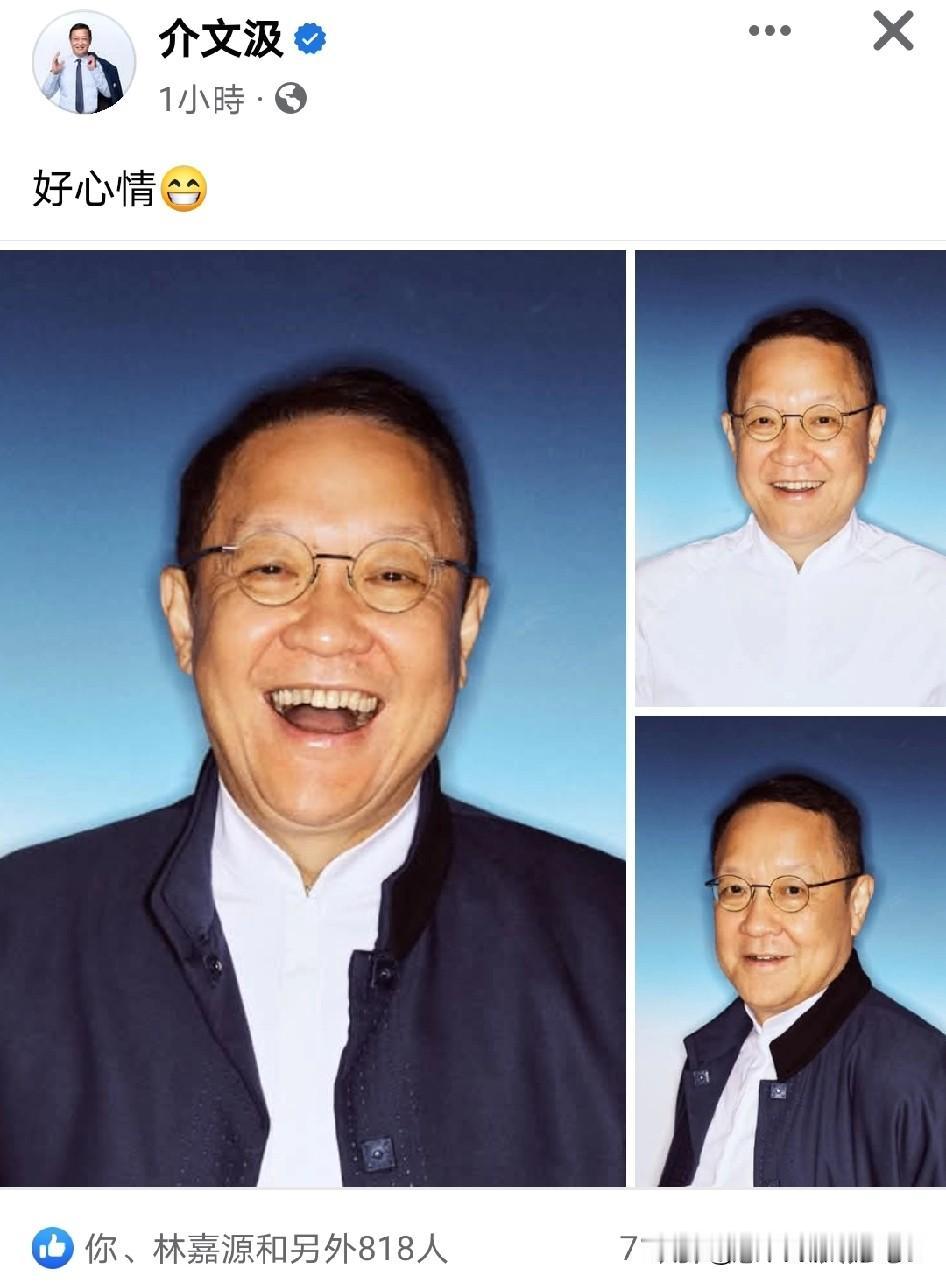 介文汲老师更新开心组照 今天下午,好久没更新状态的台湾省名嘴介文汲老师在自己社交平台更新了一组照片,照片中的介老师笑得很开心,一副老顽童模样。网友问他为何笑得这么开心,是不是因为这两天没上节目去旅游了,他说是的,还有一部分原因是因为郑丽文当选国民党主席。 哈哈,介文汲老师难得这么放得开。