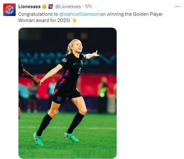 凭借在俱乐部和国家队的出色表现,莉亚·威廉姆森荣获《都灵体育报》金球奖金秋观赛