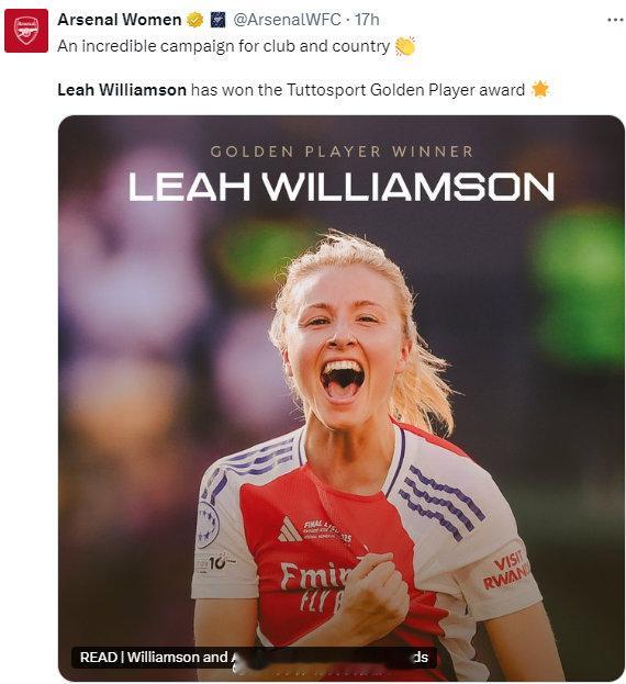 凭借在俱乐部和国家队的出色表现,莉亚·威廉姆森荣获《都灵体育报》金球奖 金秋观赛季 阿森纳著名教授