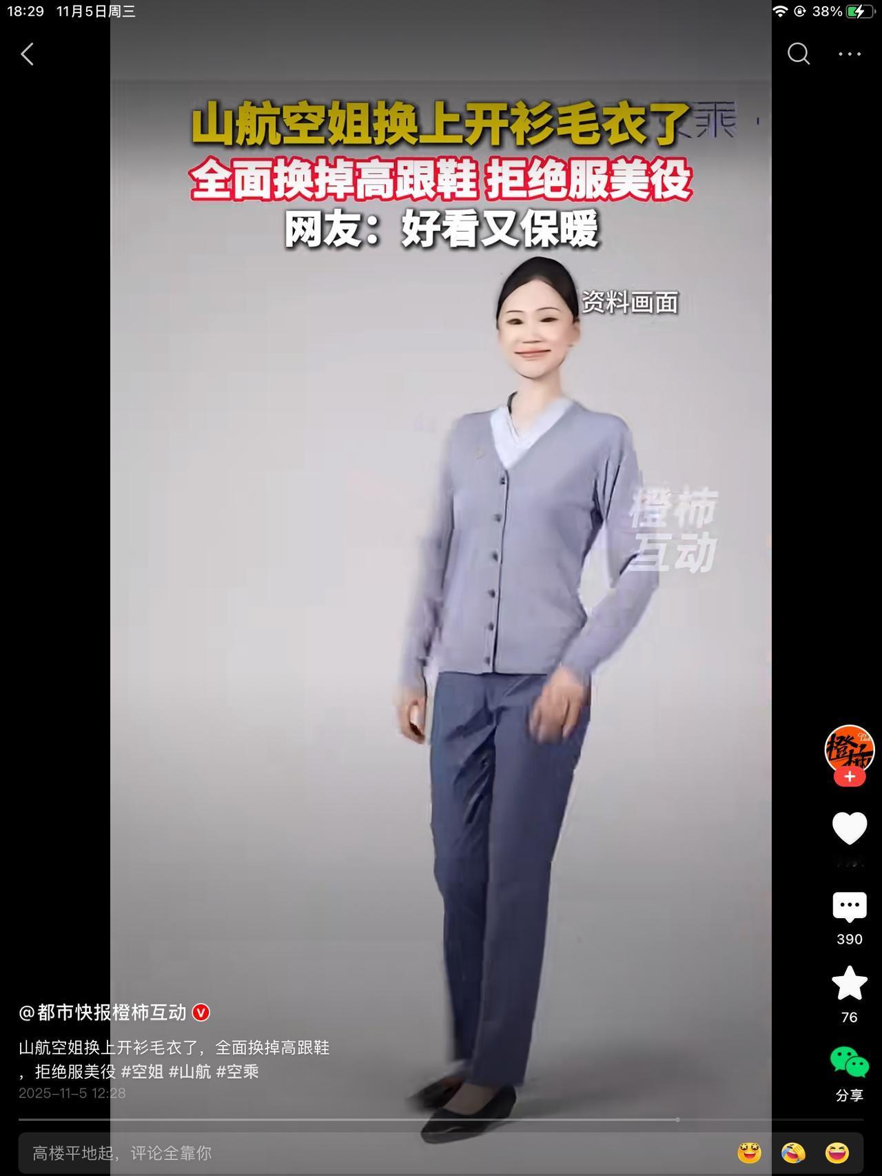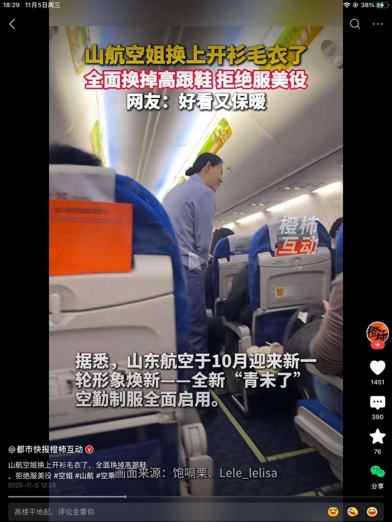 山航打响平民化服务第一枪!全面换掉高跟鞋,超短裙,拒绝服美役。网友是众说纷纭。在我看来,挺好的。 从女性视角看,超短裙,黑丝袜,有种逛商k的感觉。不自觉的代入服务服务这一深层里面。总感觉她们挣得钱里,有一部分高消费是乘客为美丽美貌买单。没有歧义,有的是,两个世界的,不可相交的落差感。 都是老百姓的孩子,有钱人家谁干这个,说破天,也是个服务行业。高端能高到哪去。高是有了,端,不知道。没有必要为了迎合某些人认为的美,牺牲空乘的舒适感和安全性,这是进步的表现。 其次,保暖。也从侧面反映了,航空运输,已经平民化了。 还有人说,霸道总裁爱上干保洁的我别闹,这个行业,依然是有门槛的。跟月薪三千的我,还是有一大截的差距的。😀给山航点赞!