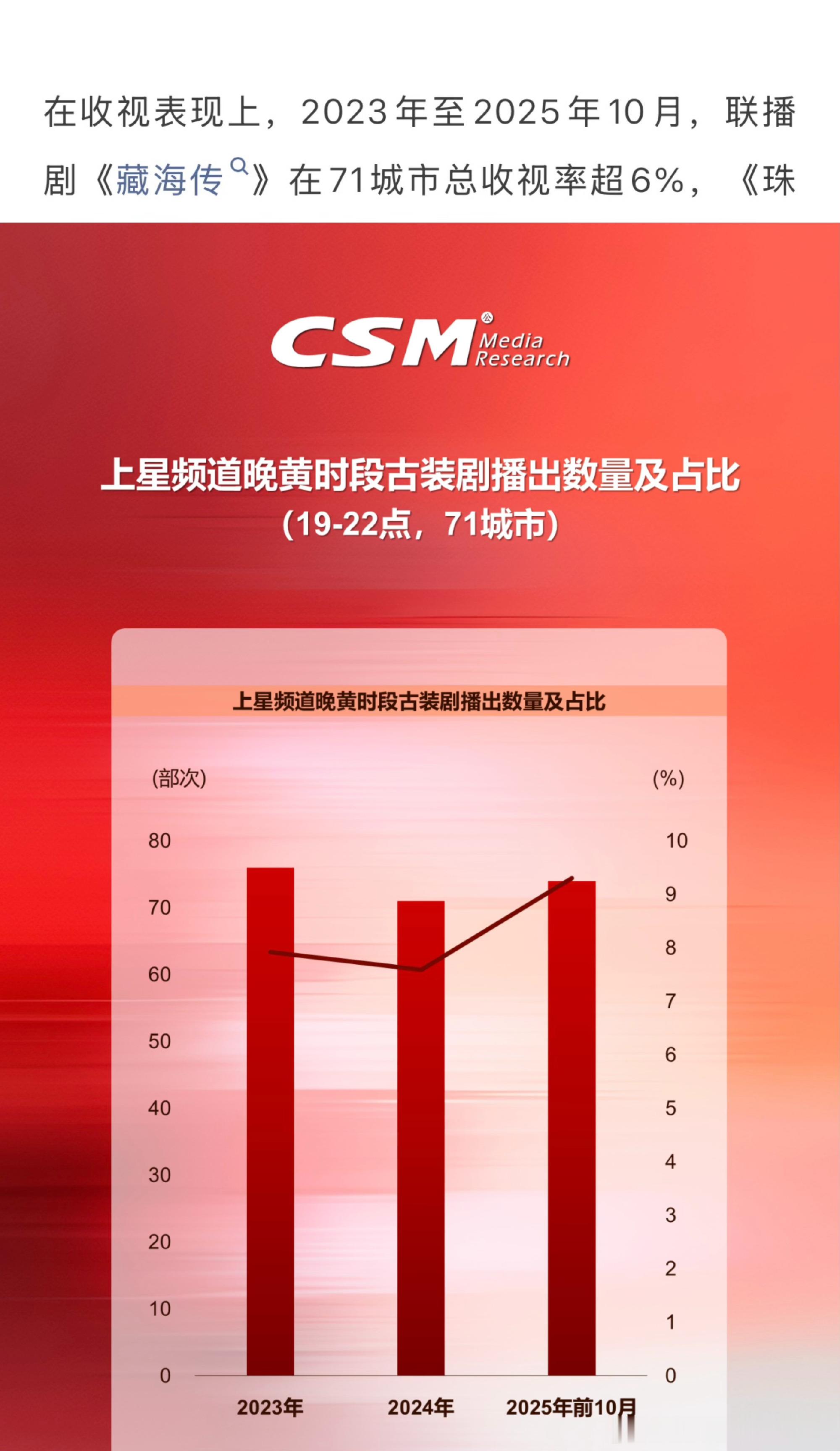 上星频道晚黄金时段古装收视中,2023年至2025年10月,联播剧《藏海传》在71城市总收视率超6%,2025年1月至10月,其全媒体触达人次超250亿,全媒体视听总时长近1300亿分钟,大小屏用户各占半壁江山,剧王是这样的🐮